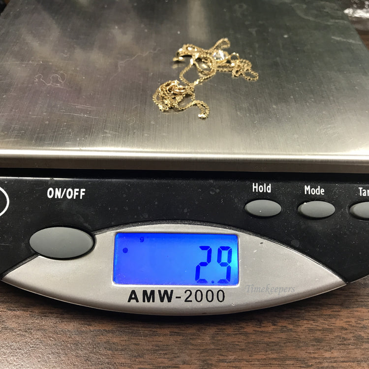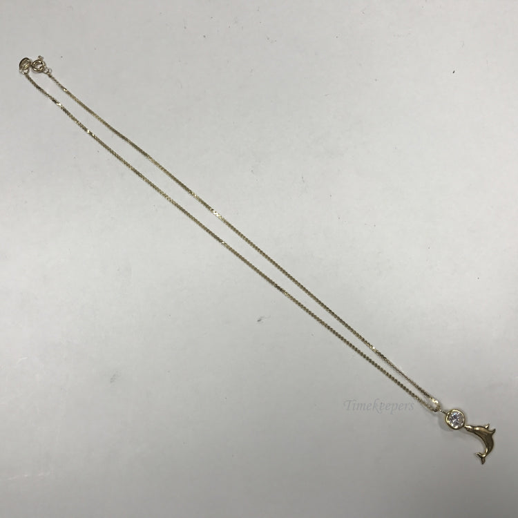 • 14K Yellow gold chain and pendant. Pendant in a shape of dolphin, holding cubic zirconia ball.