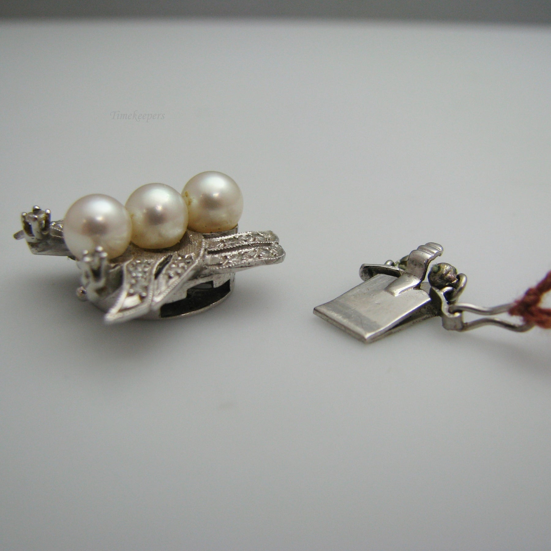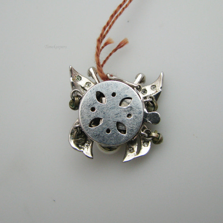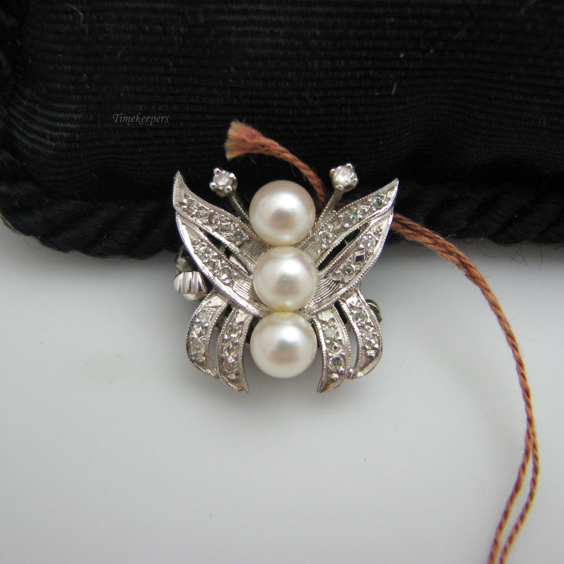 This necklace lock contains three (3) pearls and 20 diamonds, all of which are round cut. It is shaped like a butterfly. It would pair well with a pearl or diamond necklace. This lock is not stamped.