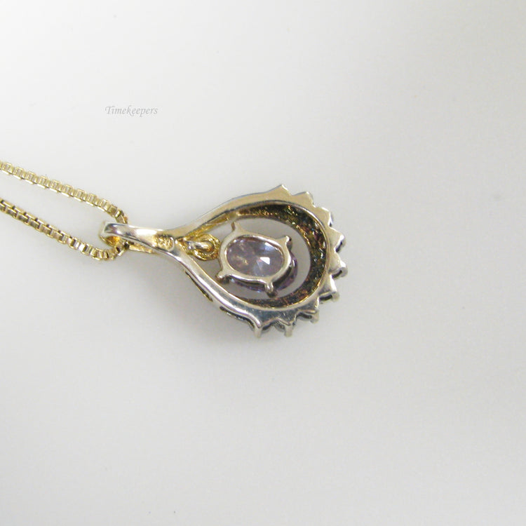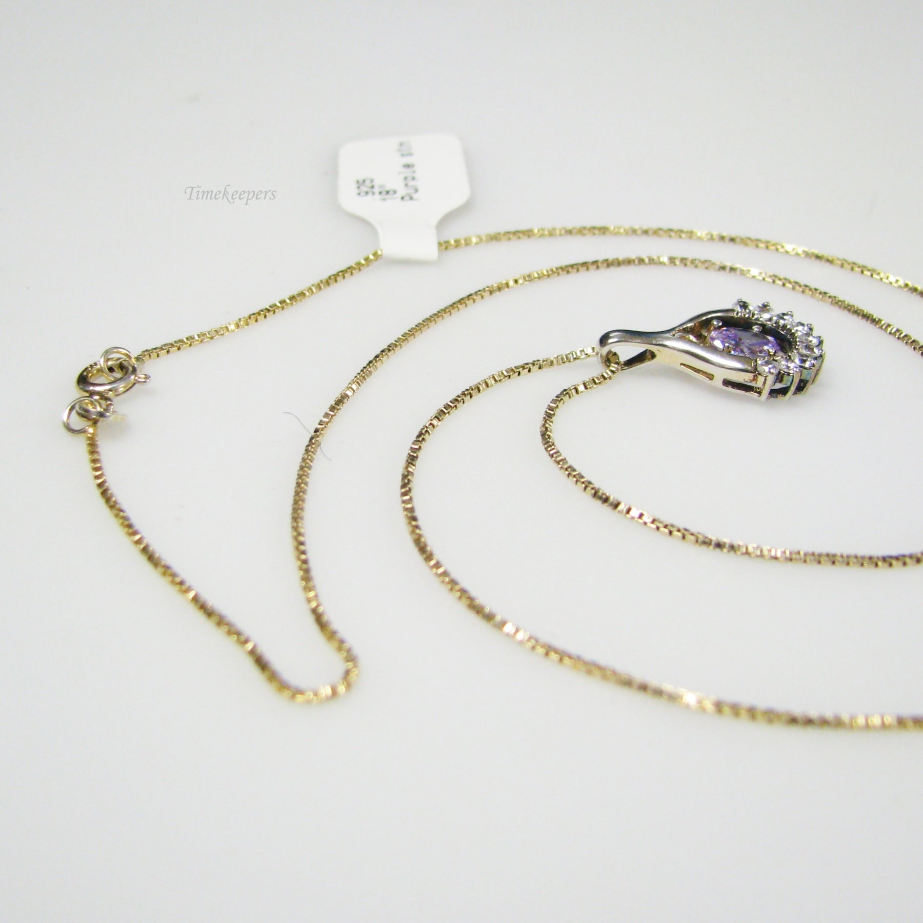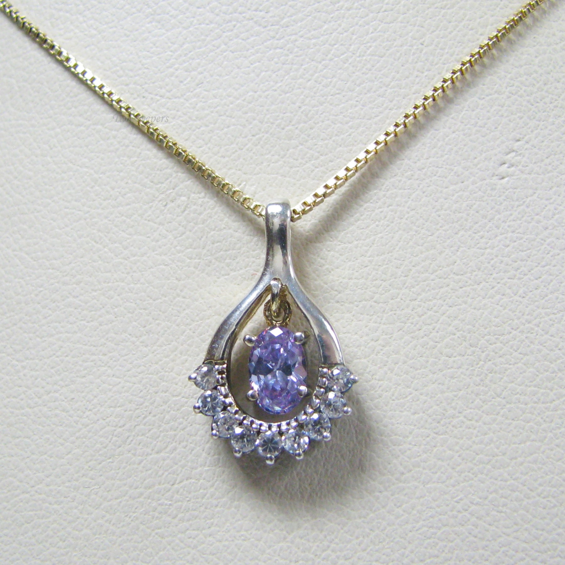 These necklace contains nine Cubic Zirconia gems (round cut) and one purple stone of unknown type (oval cut). Both the necklace and the pendant are stamped.