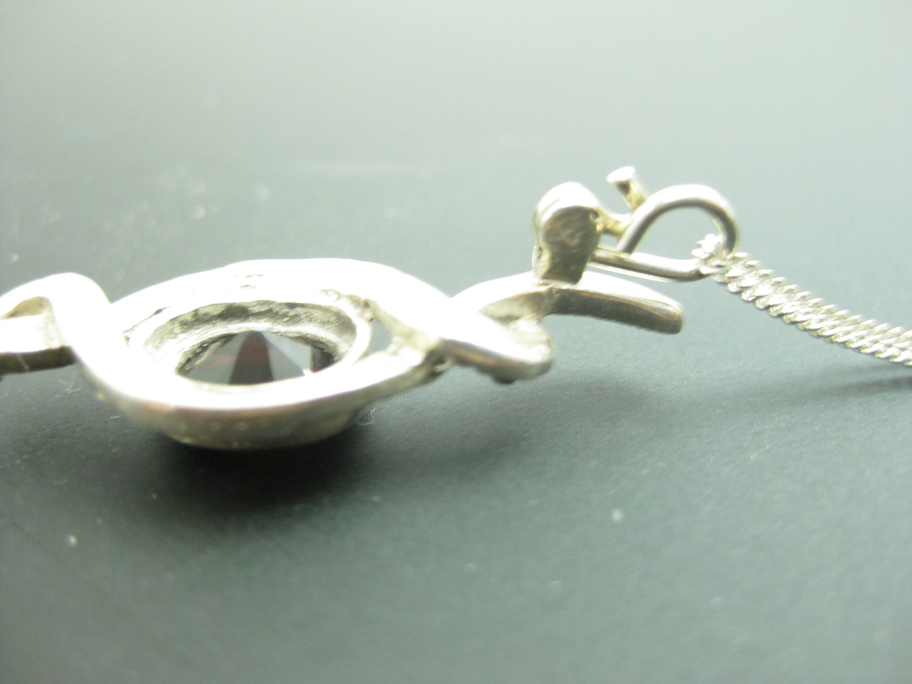 This is an elegant garnet pendant with marcasite stones on a sterling silver chain. The stunning ruby red of the garnet center stone is an eye catcher.