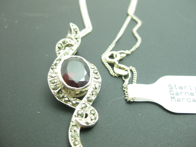 g265 Elegant Sterling Silver Garnet & Marcasites Pendant with Silver Chain