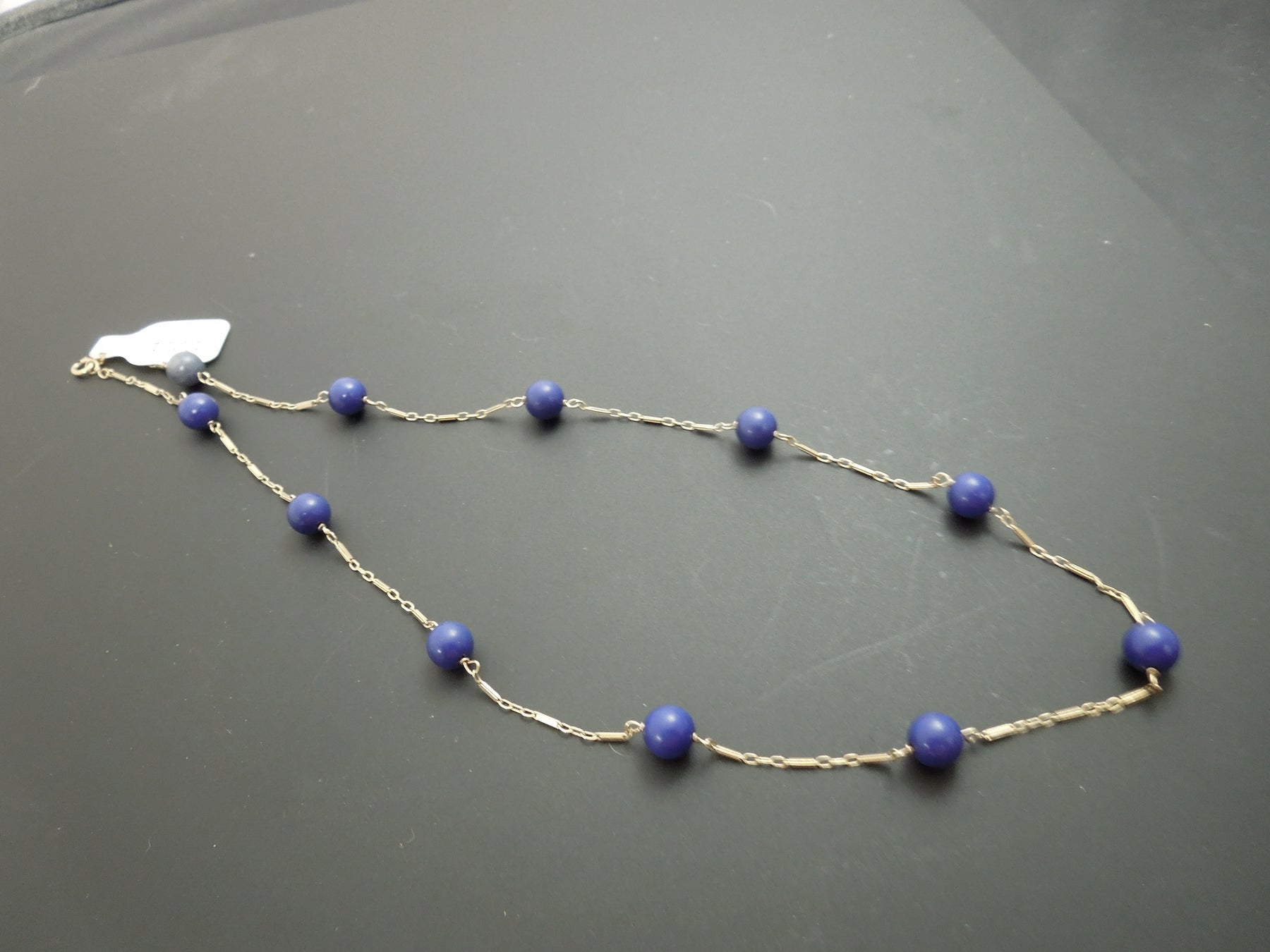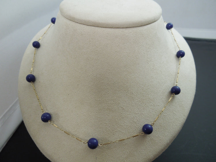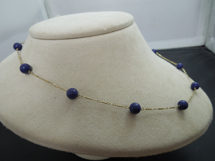 This ring is a very pretty necklace. Intermittent strand of a delicate 14kt yellow gold chain, with settings of round Lapis Lazuli .