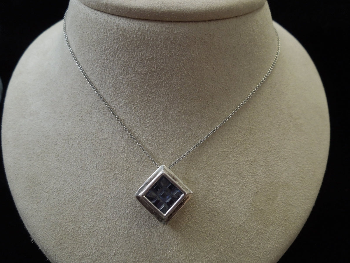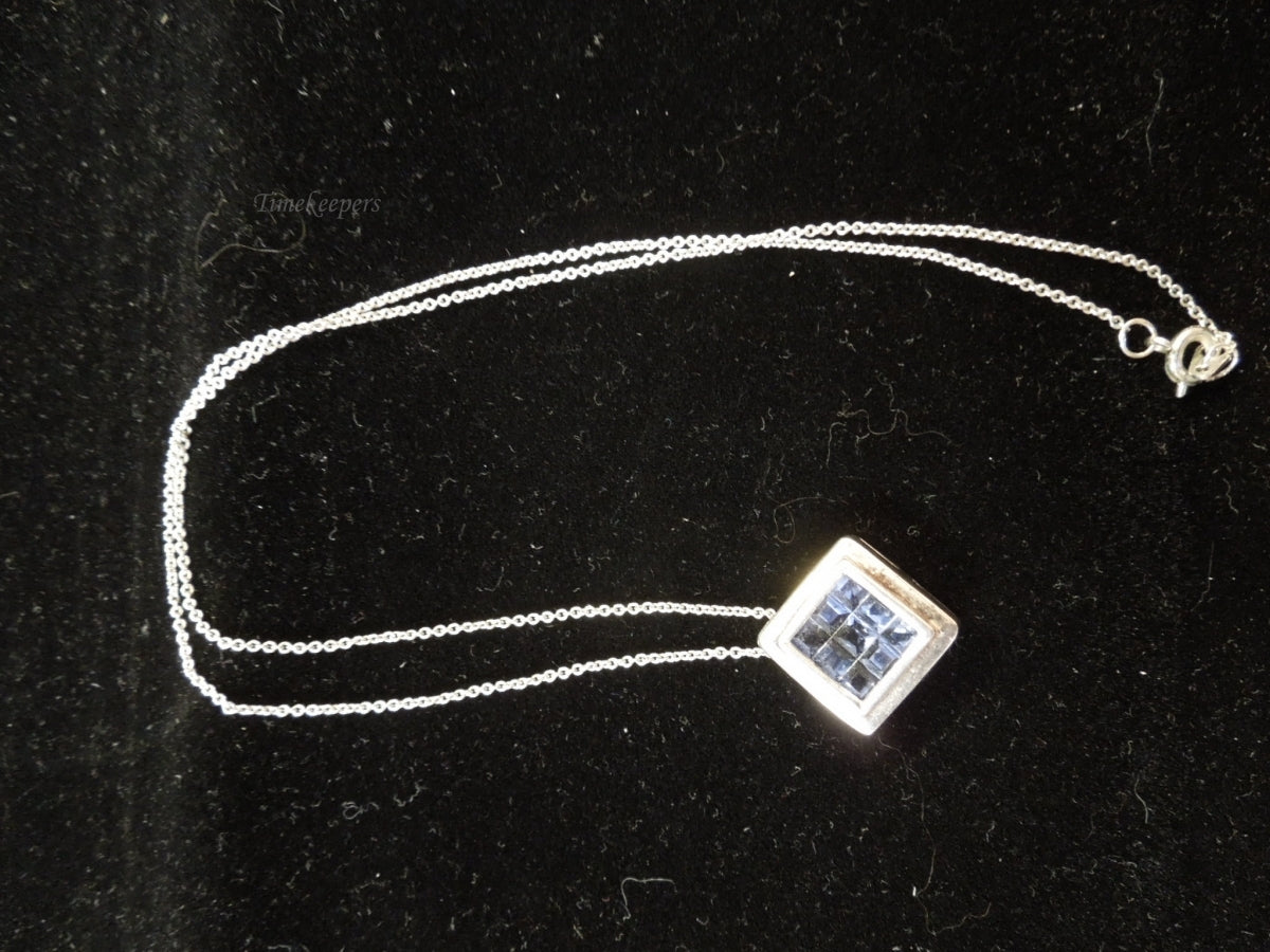 This is a pretty square pendant featuring 9 princess cut purple stones. It comes on an 18" sterling silver chain, which is stamped as well as the pendant. Would be a nice anniversary, birthday, Christmas, Mother's Day or Valentine's Day gift for her.