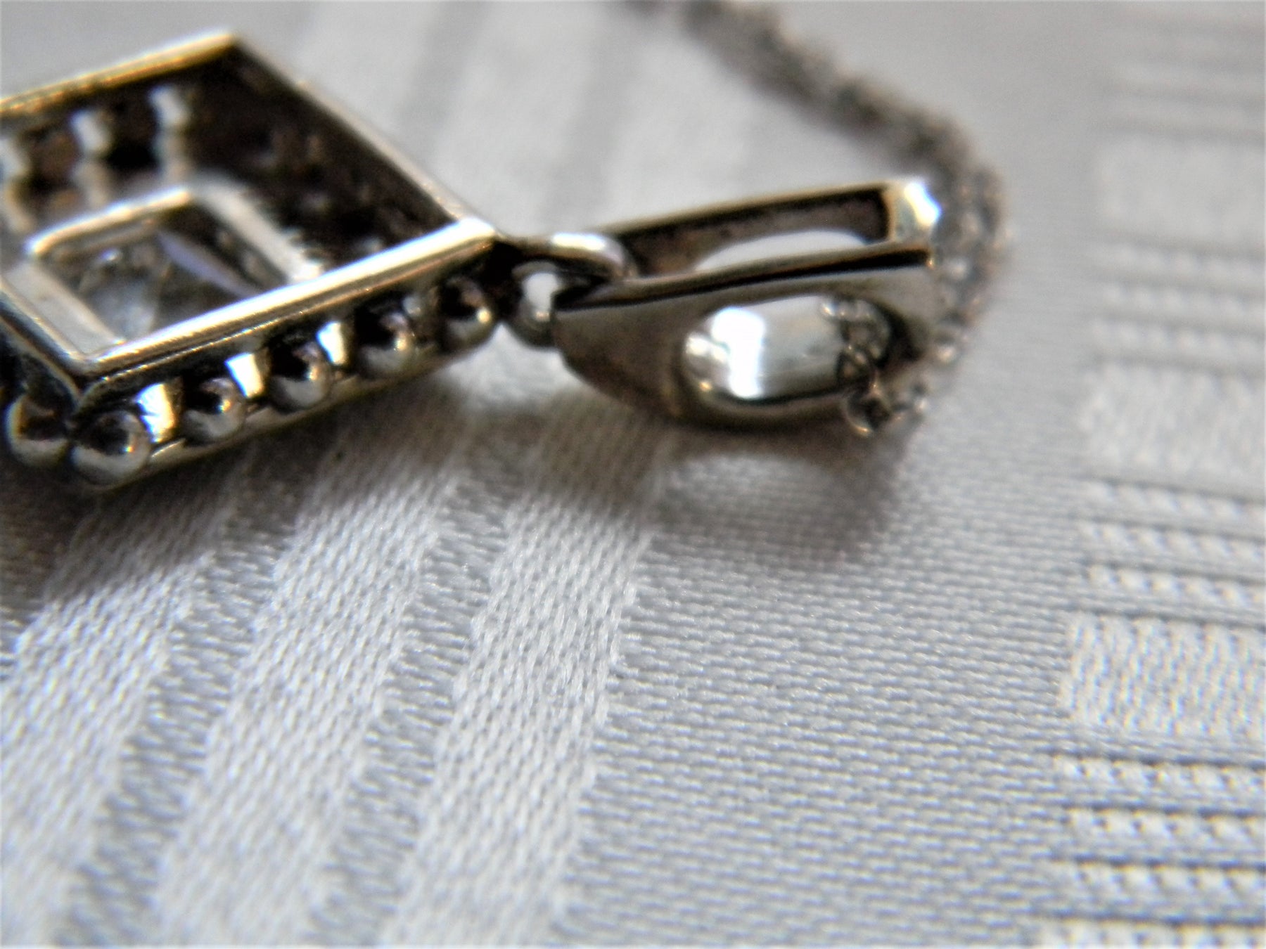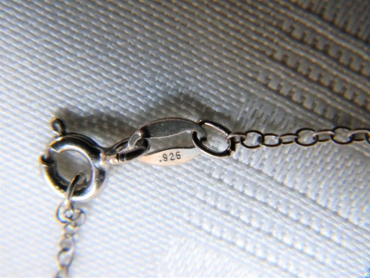 This is a stunning necklace features a diamond shaped pendant with a center crystal surrounded by marcasite on a rolo chain. The back of the pendant is marked PJM 925 and China. The chain is marked 925.