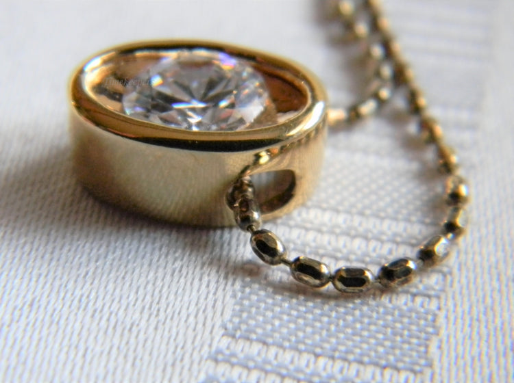 Stunning necklace featuring a ball chain with an oval pendant set with a round clear glass stone. All is gold plated. The chain is marked 925 and Danecraft. The chain features a spring clasp.