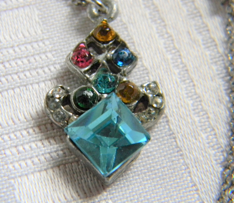 Beautiful silver tone pendant with colored glass stones on a sterling chain. Clasp works as it should and is marked Sterling.