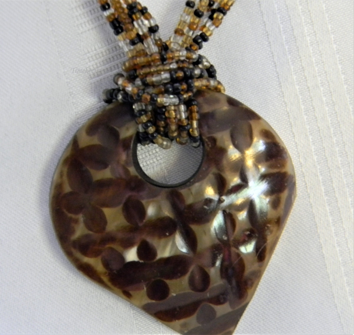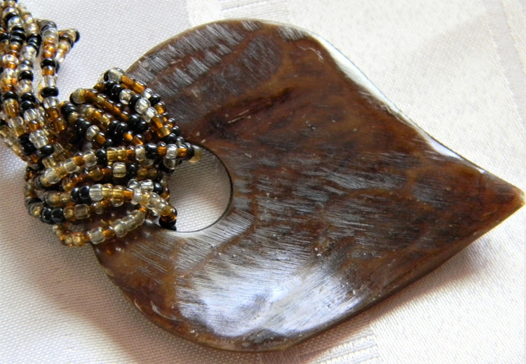 This is a stunning vintage five strand necklace featuring glass seed beads in amber, clear, black and brown. These strands are