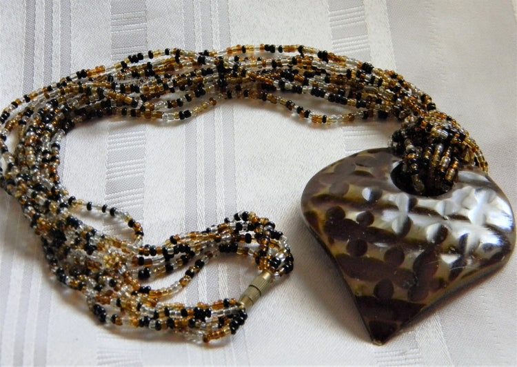 h923 Beautiful Vintage Multi Strand Seed Bead Necklace with Heart Pendant