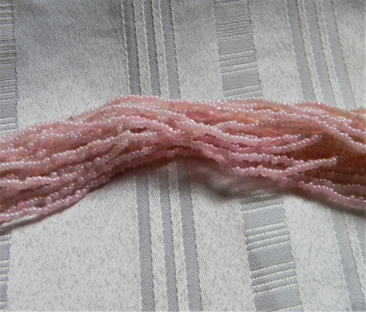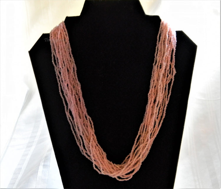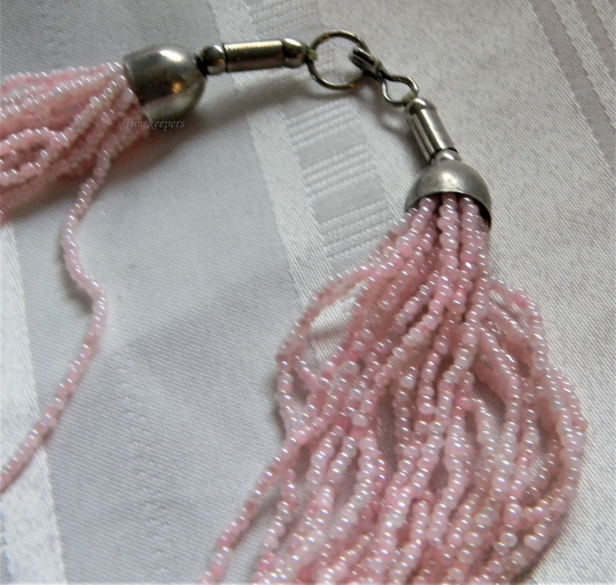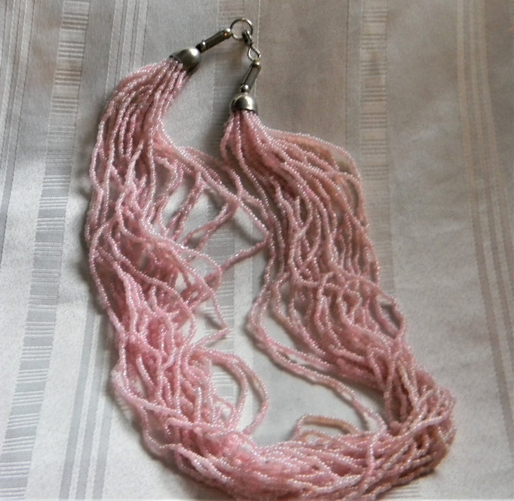 This is a beautiful seed bead pink multi strand necklace. The end caps and the clasp are in a silver tone. There are 20 strands in this necklace.