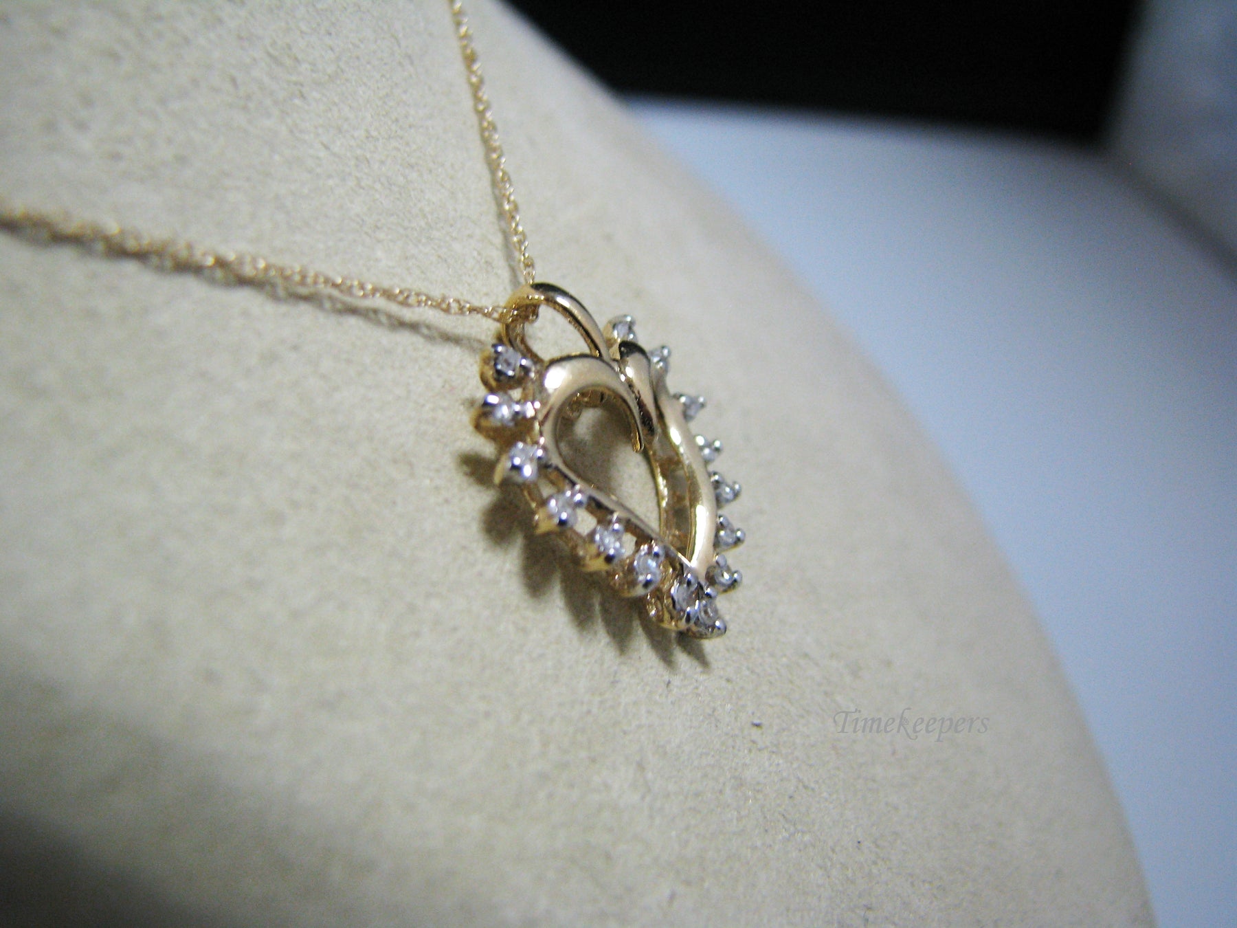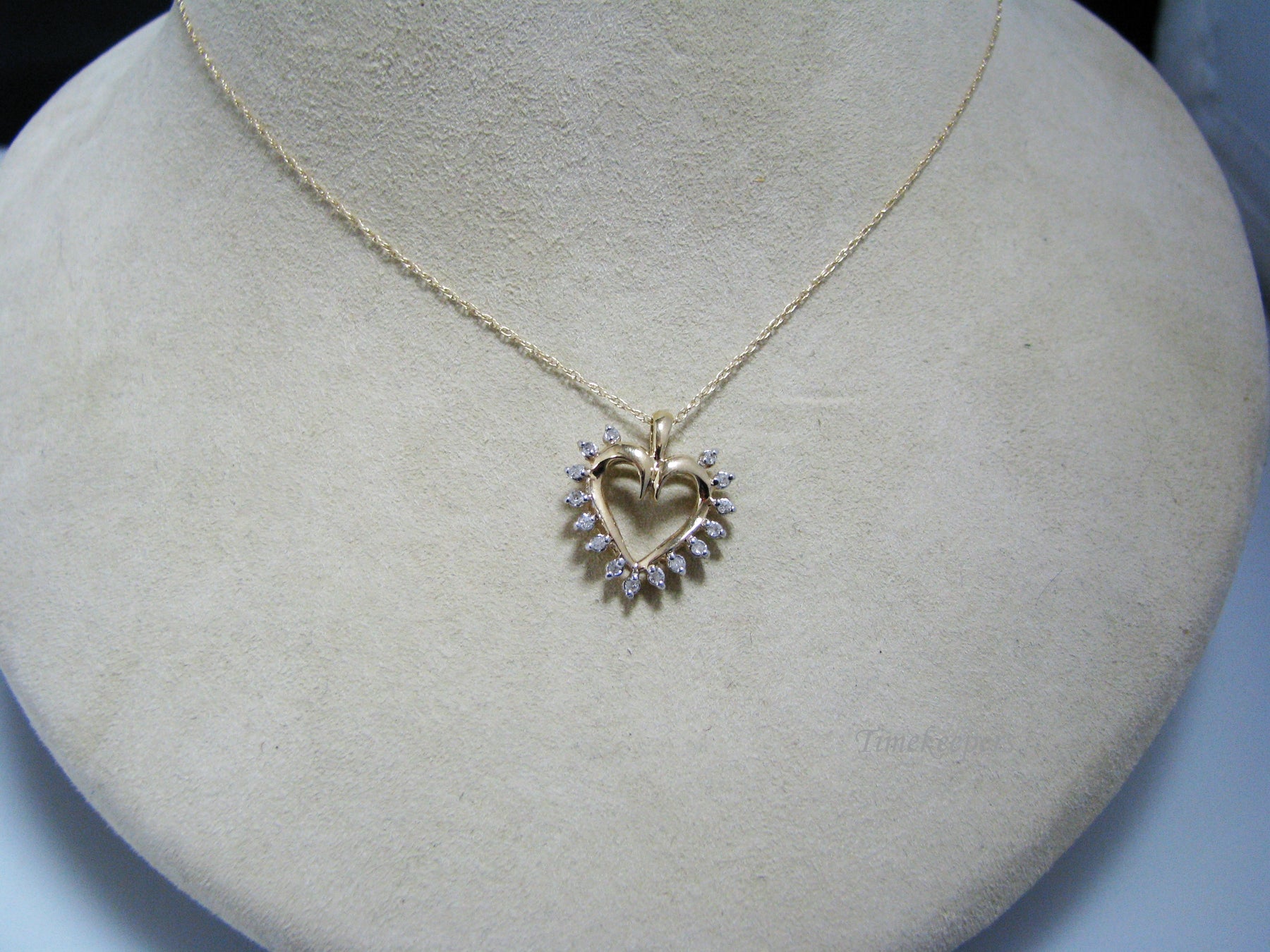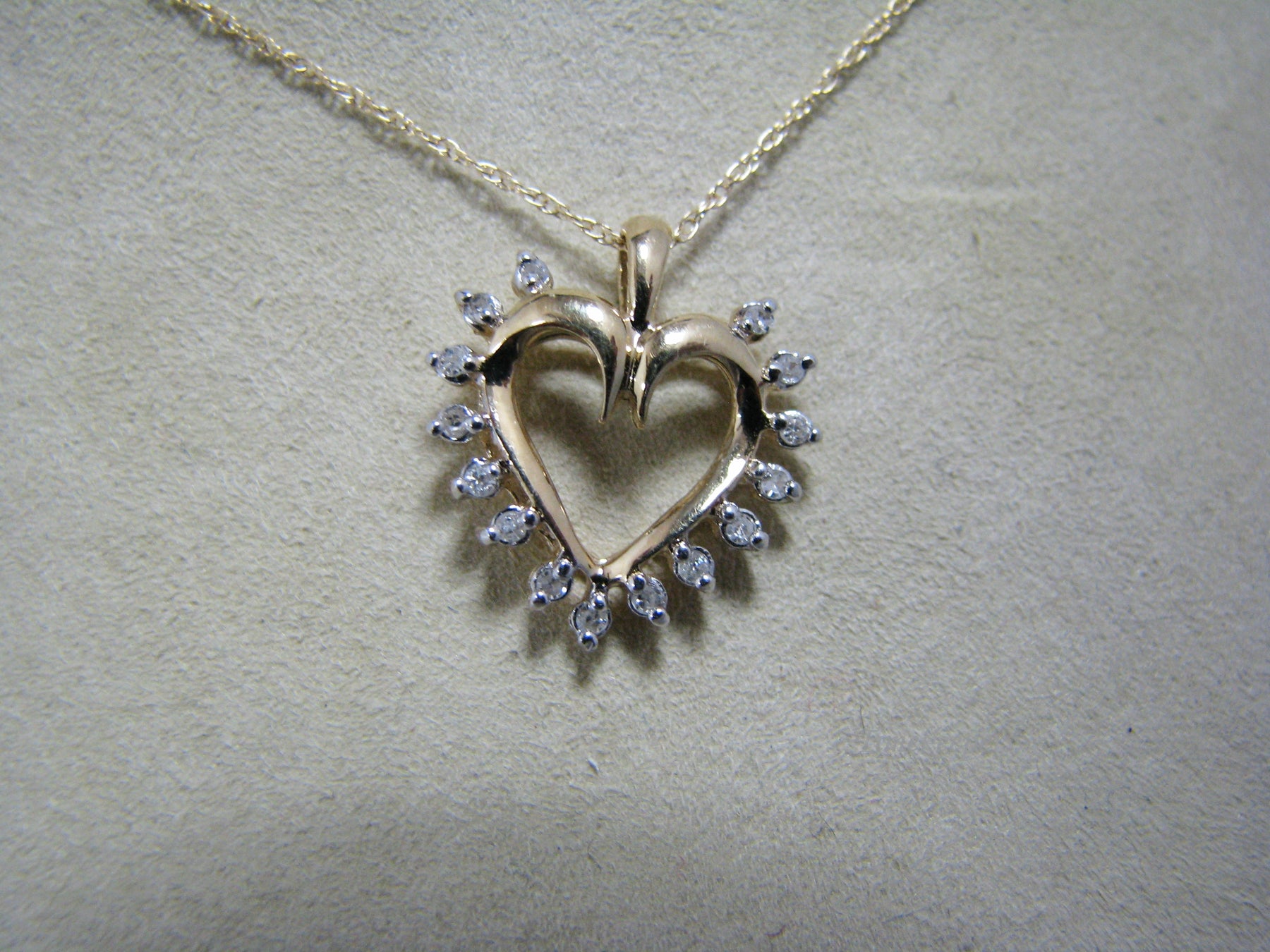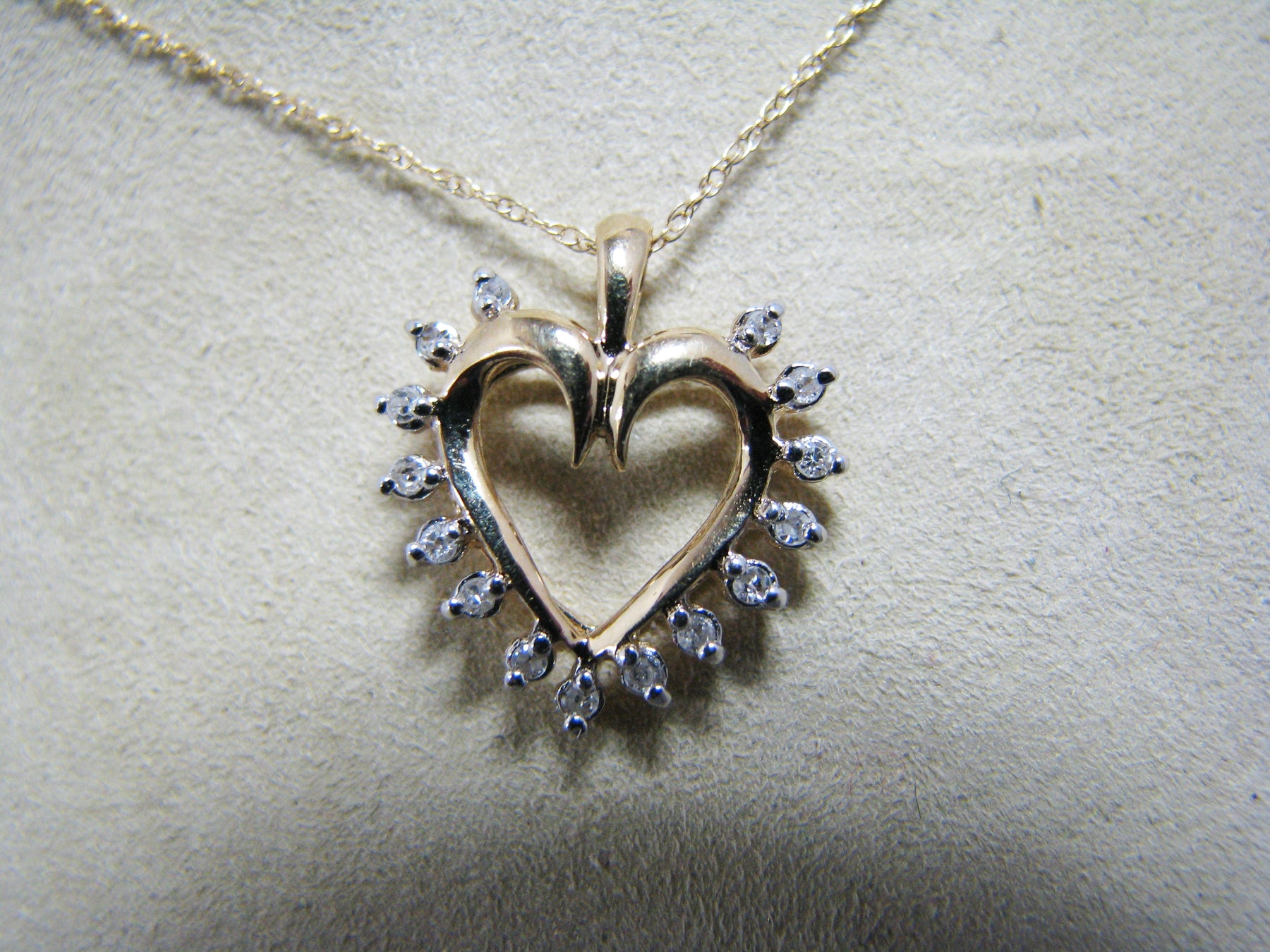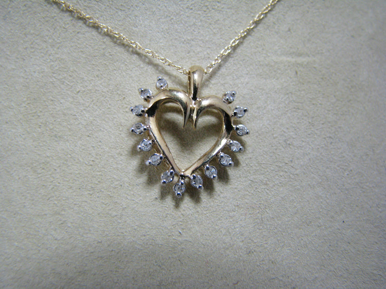 This beautiful 14k yellow gold heart pendant features (15) diamonds at approx. 1.25 mm each. This is hanging from a lovely delicate 10k yellow gold 18" chain. The spring clasp on the chain is marked 10k. Nothing else is stamped but all has been tested to 10k gold.