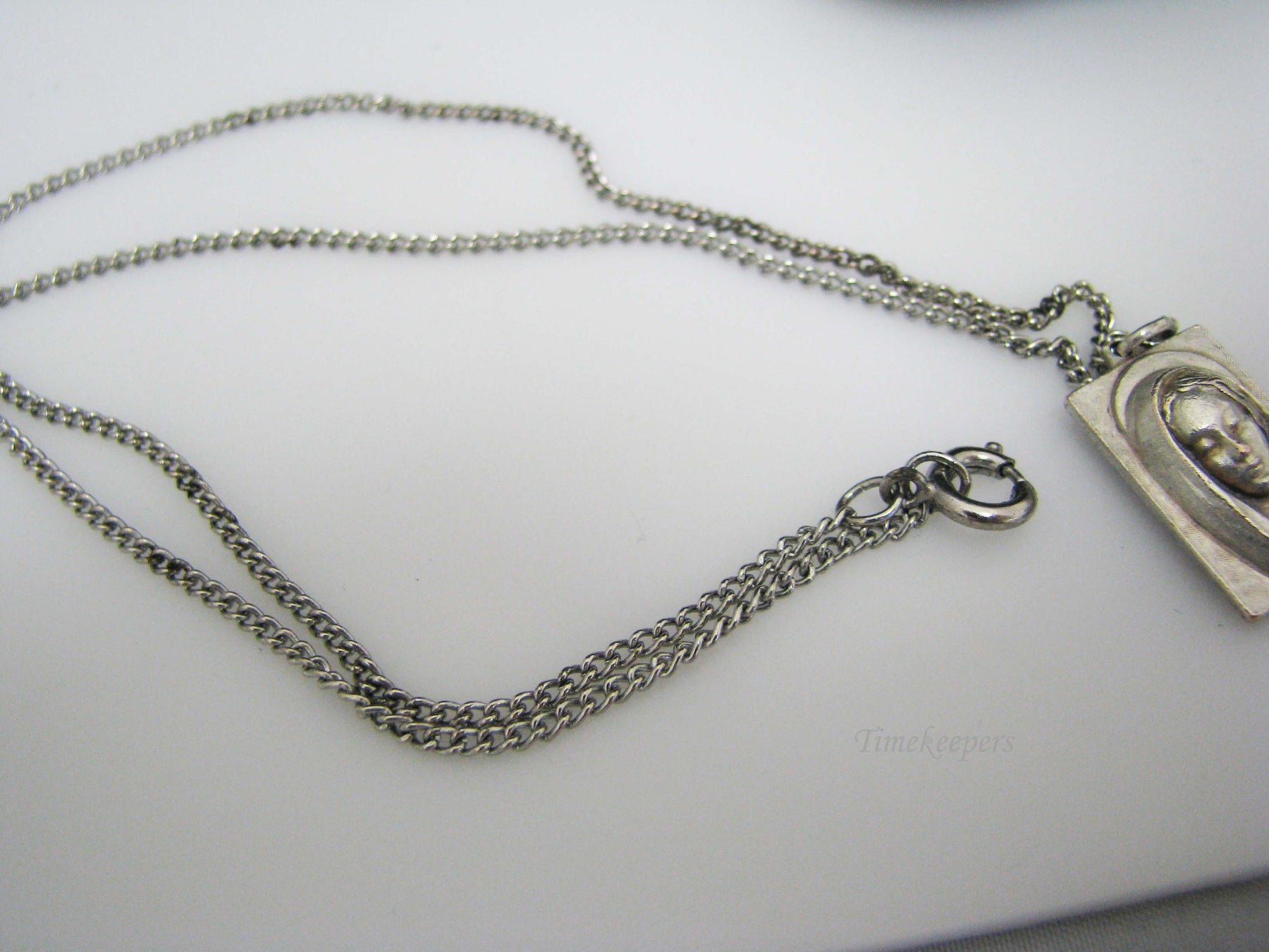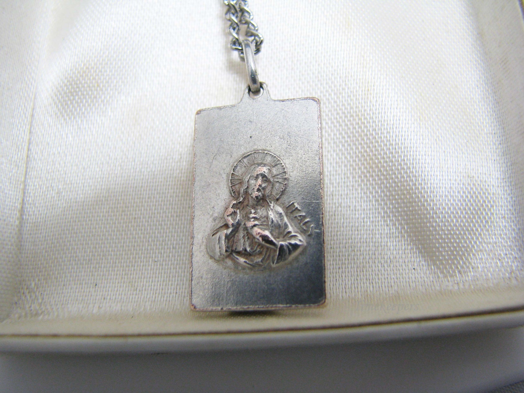 PLEASE READ ENTIRE DESCRIPTION BEFORE PURCHASING Please see pictures for more details! This rectangle medallion features Madonna on the front with Jesus on the back. The back is stamped Italy. This is not sterling silver it is a silver tone. The chain and the pendant both show tarnish. Features: