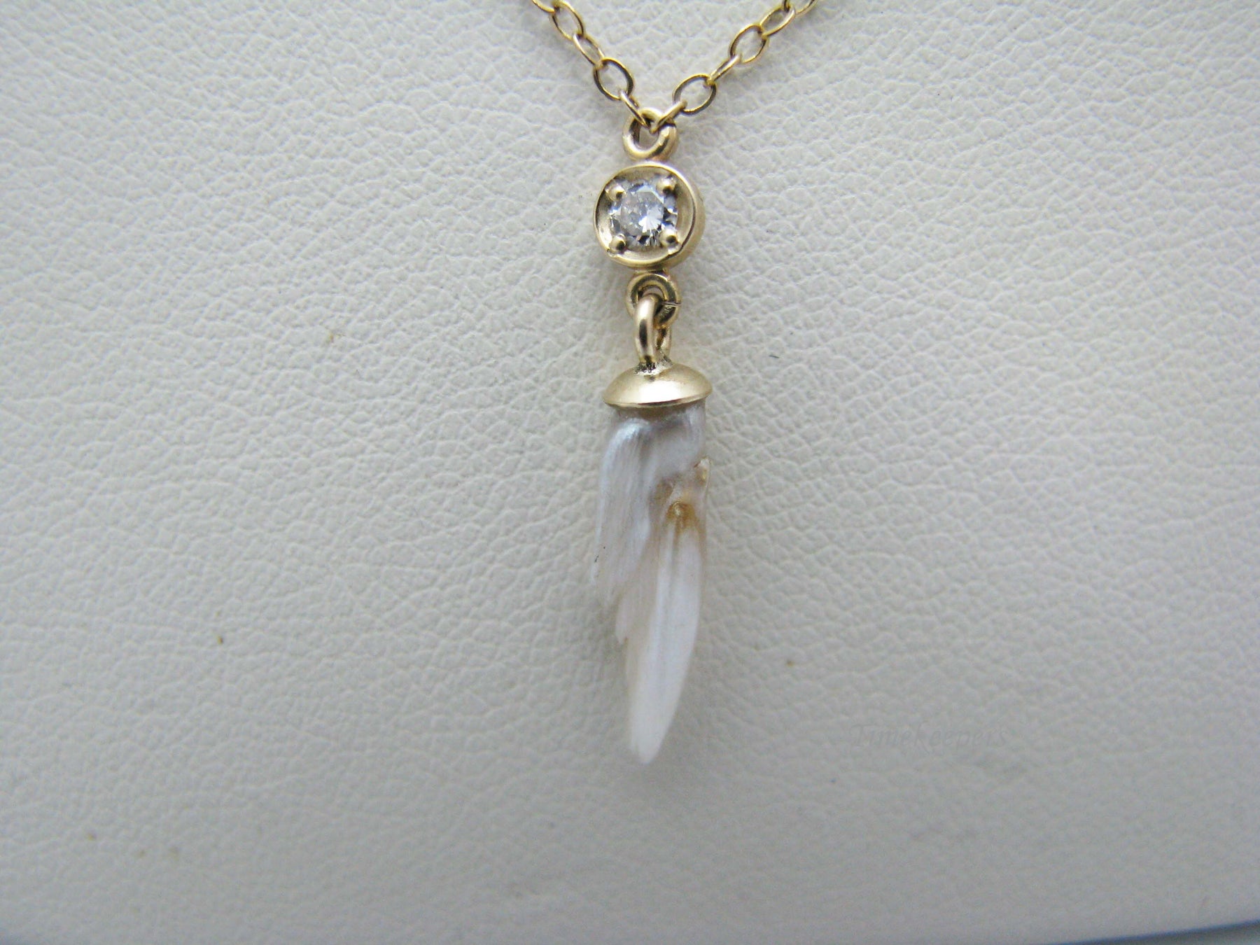 This is a lovely preowned necklace featuring a Nacre pearl dangling from a diamond in14k gold on a 14k yellow gold 18" chain.