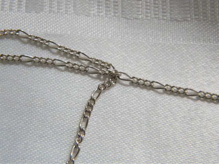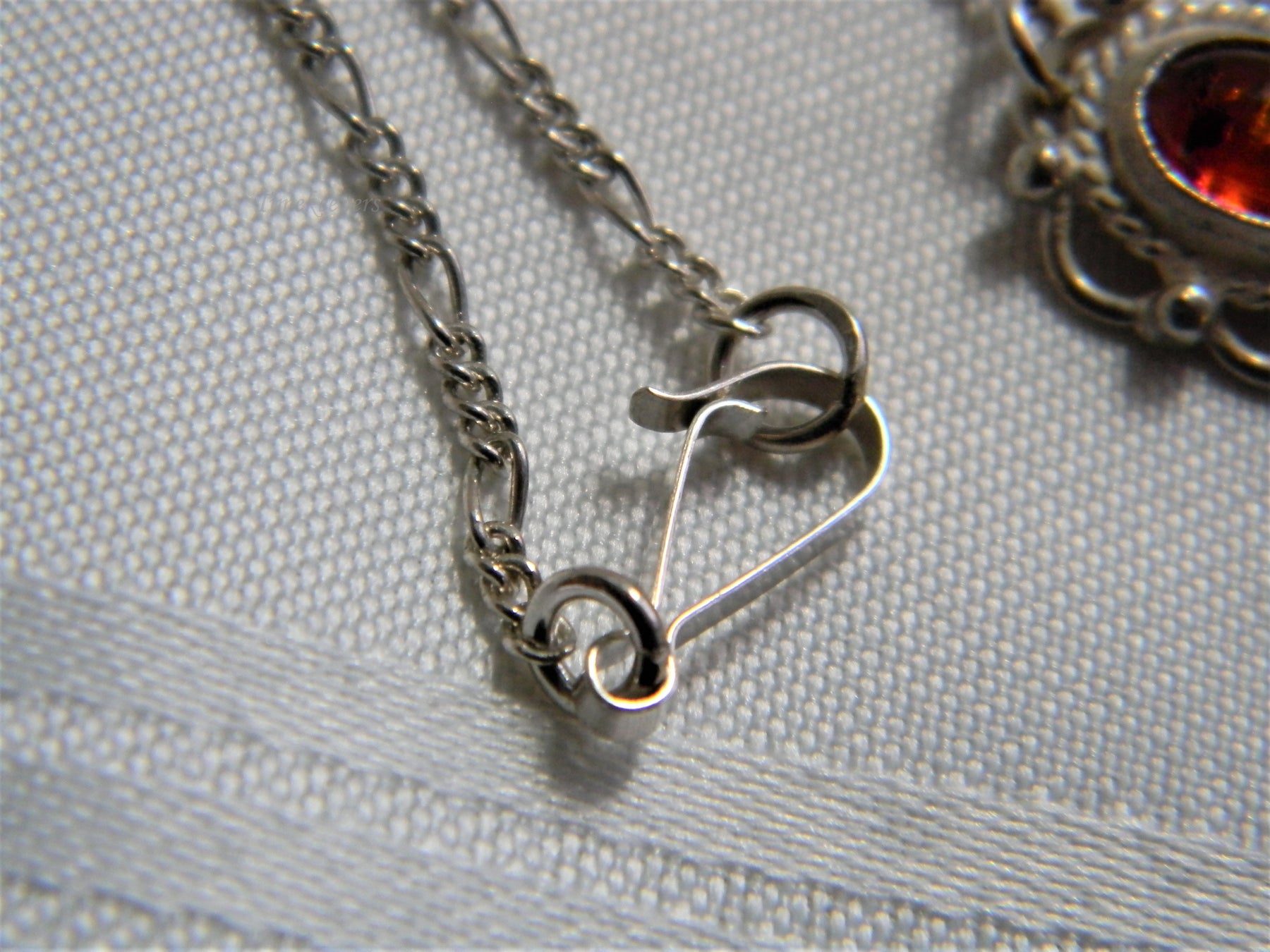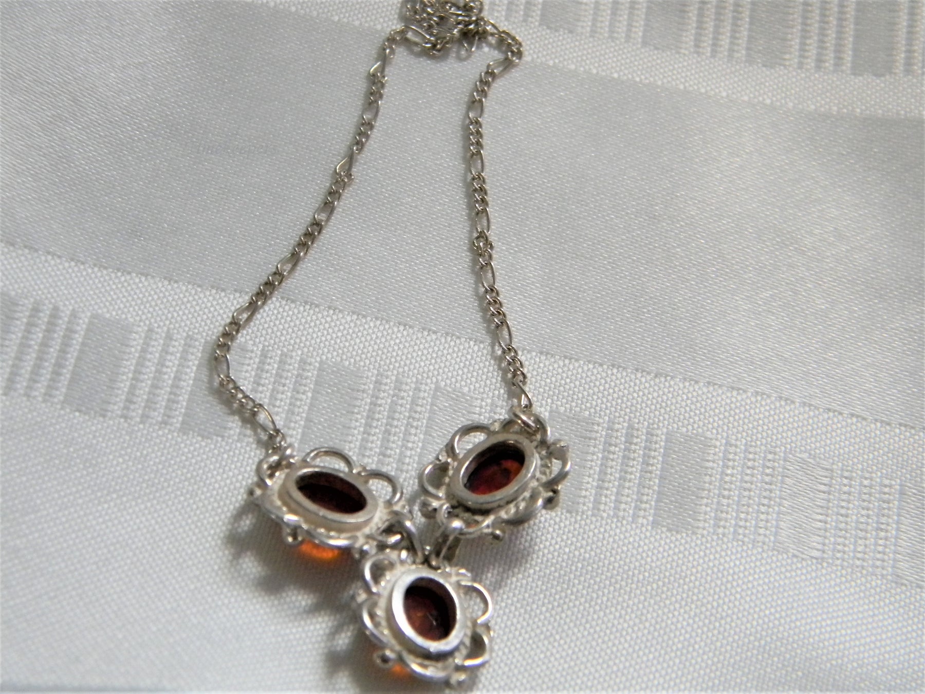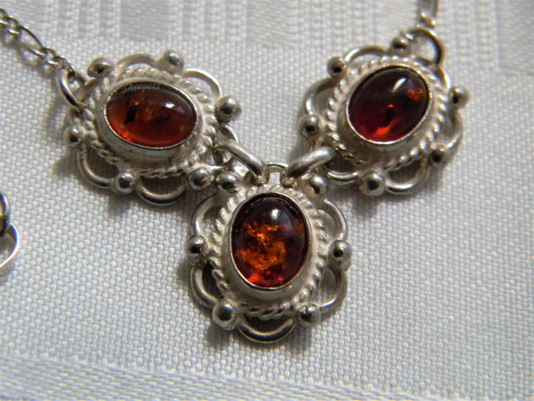 For sale: (1) Stunning Amber Necklace in Sterling Silver with Figaro Chain PLEASE READ ENTIRE DESCRIPTION BEFORE PURCHASING Pre-owned item. Good condition. Please see pictures for details. Sold as is, as seen on pictures. This stunning necklace features a triangle of amber stones set in sterling silver mountings with a Figaro chain. The clasp is a hook. Specifics: