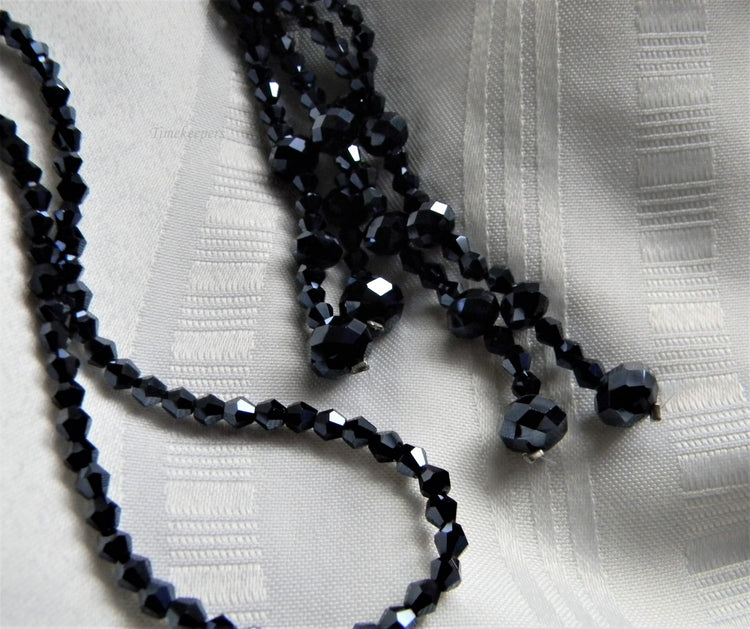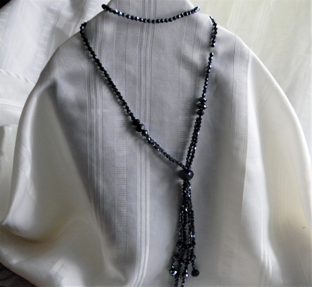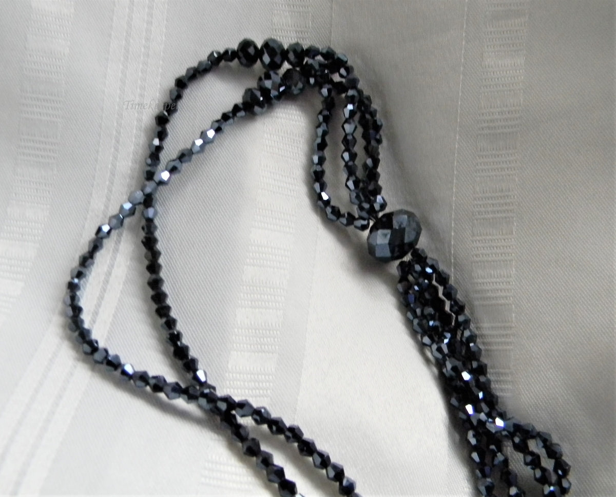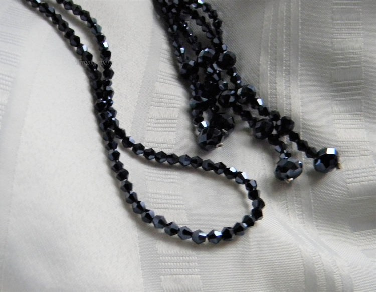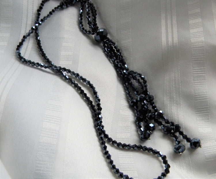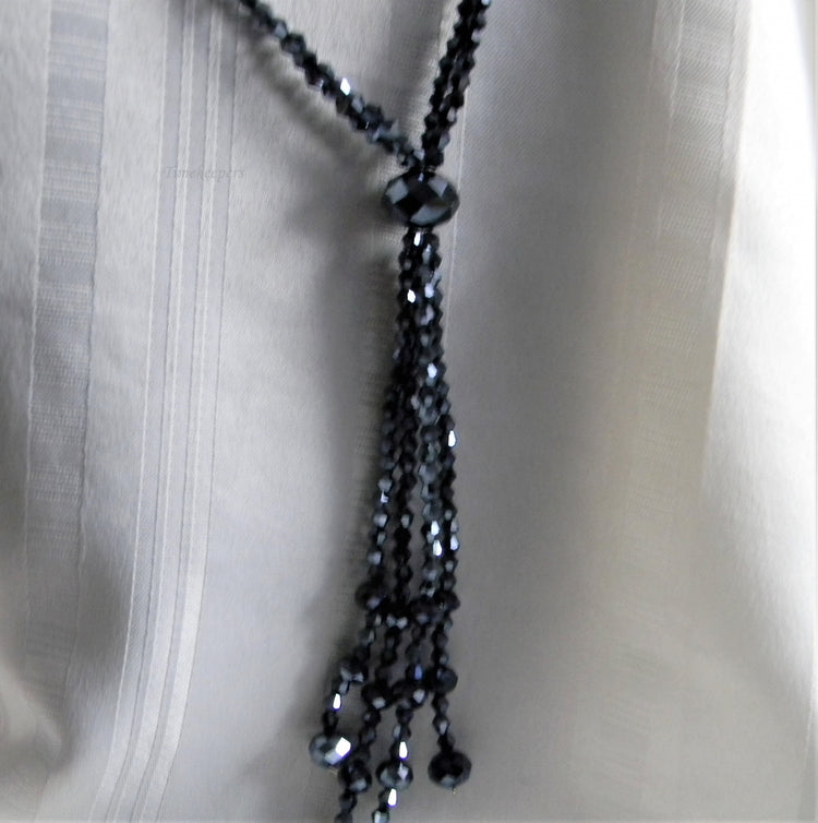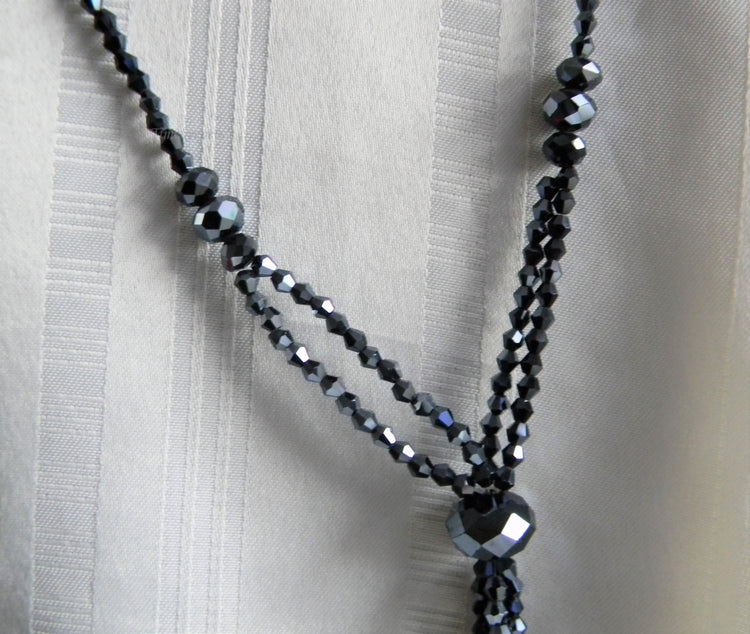 This necklace is made of beautiful faceted dark blue borealis beads of varying sizes. They come together at one larger bead with four tassels hanging from this larger bead. This is a continuous necklace that will slip on over the head.