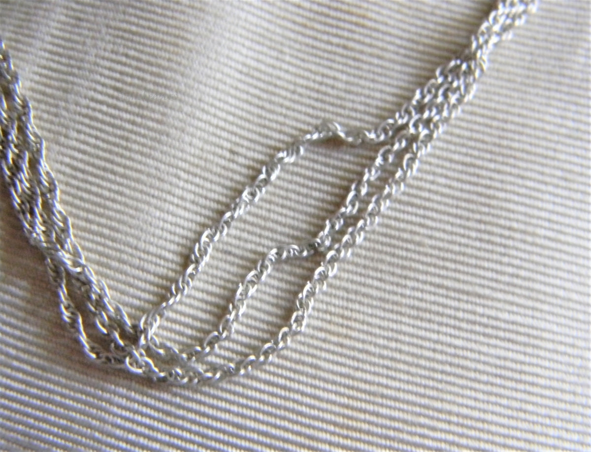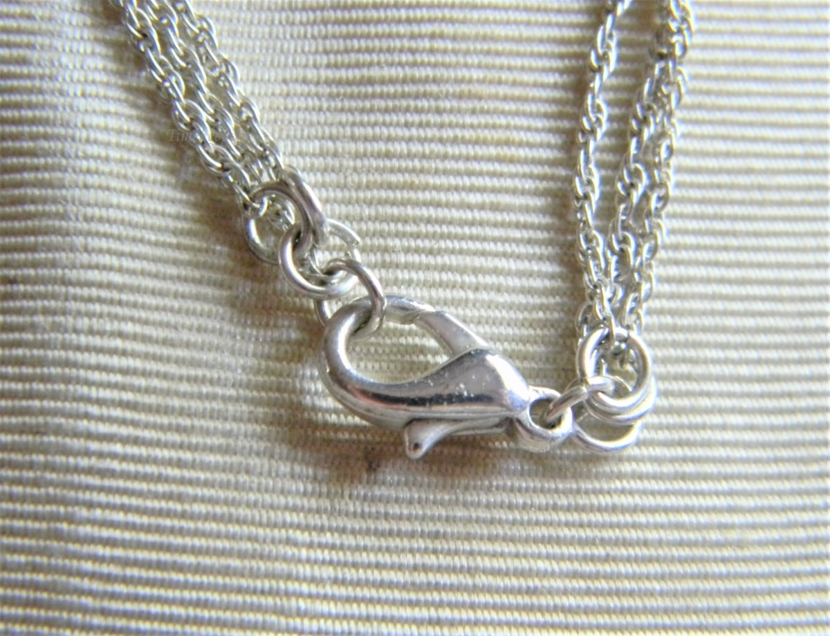 This is a very pretty necklace featuring three strand of a silver tone rope chains with a lobster claw clasp.