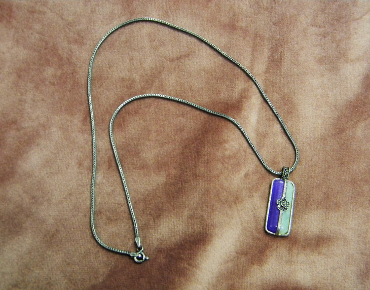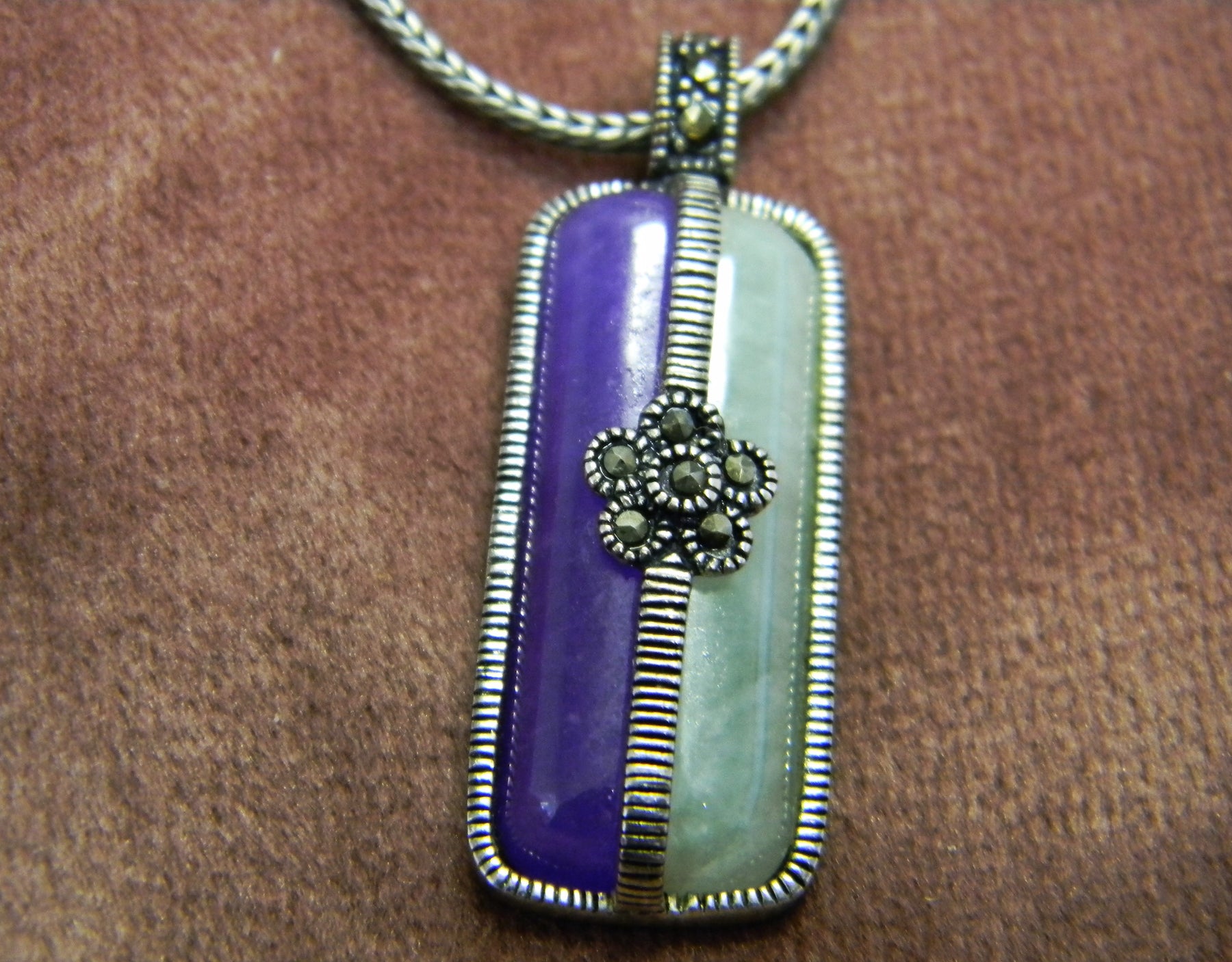 This stunning necklace feature a purple and white stone set next to each other with a strand of silver running down the center. There is a pretty little flow embellished with marcasite.