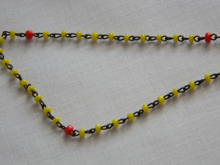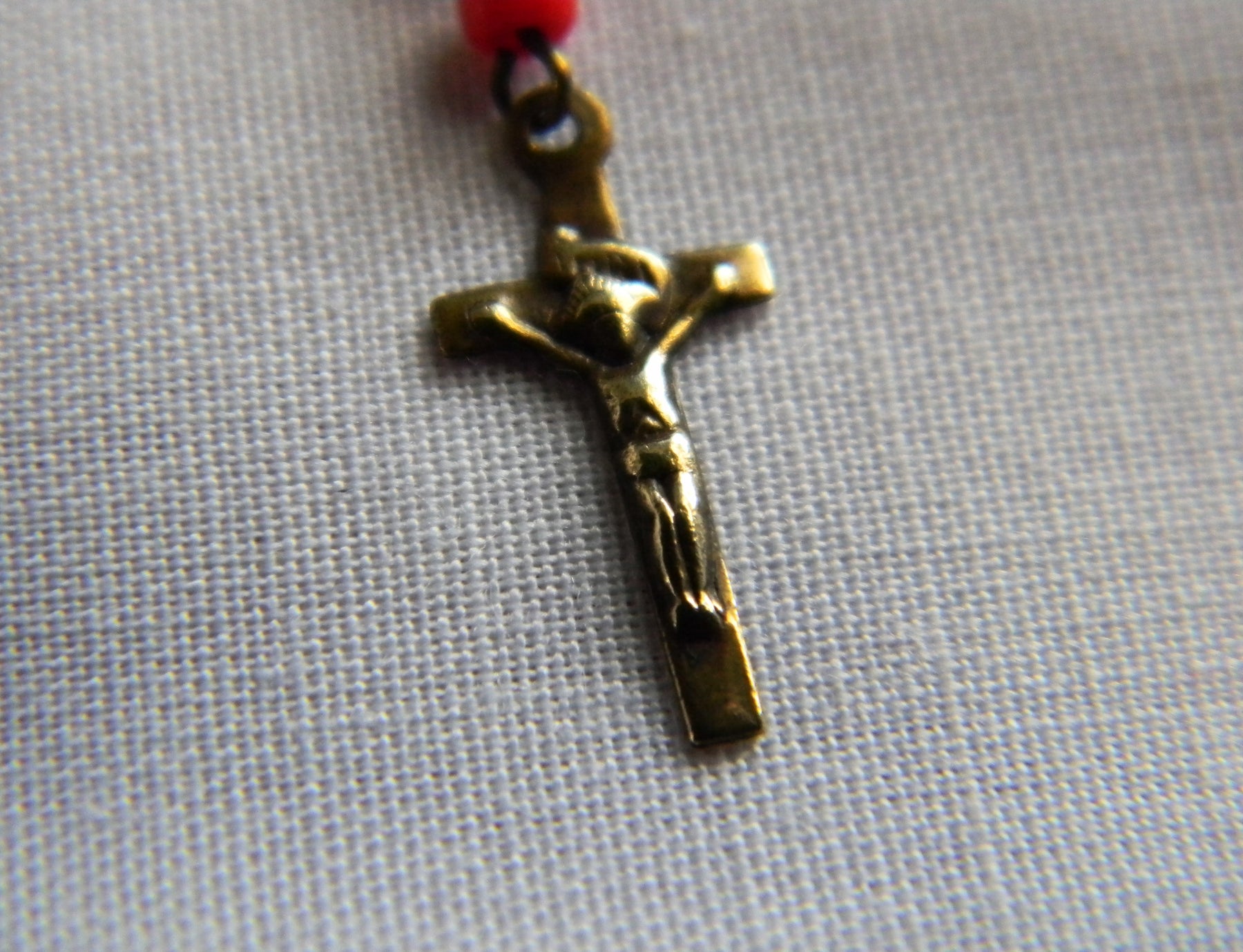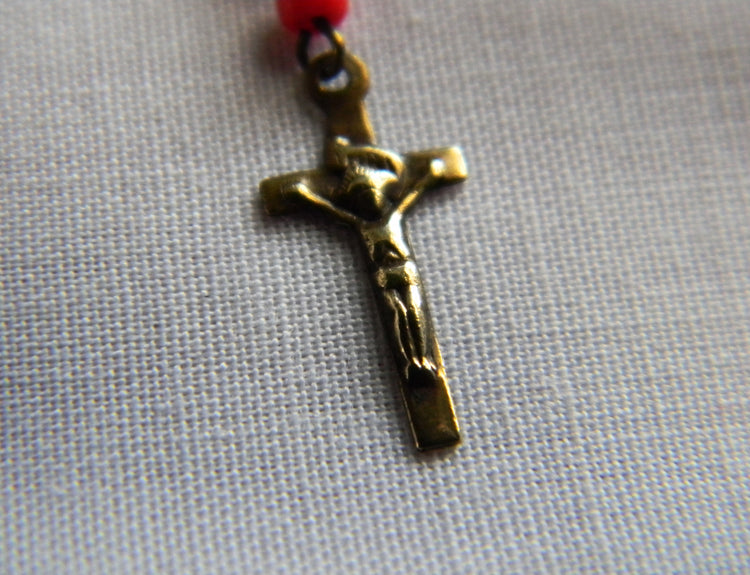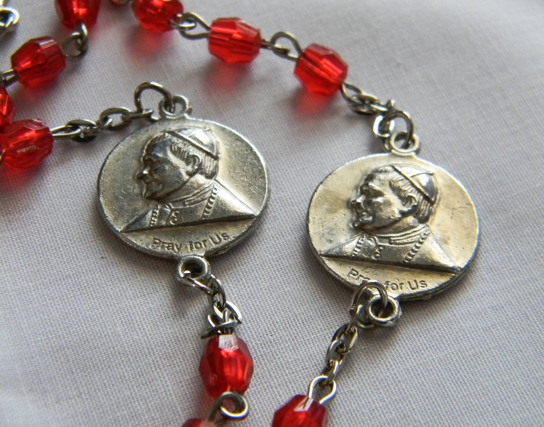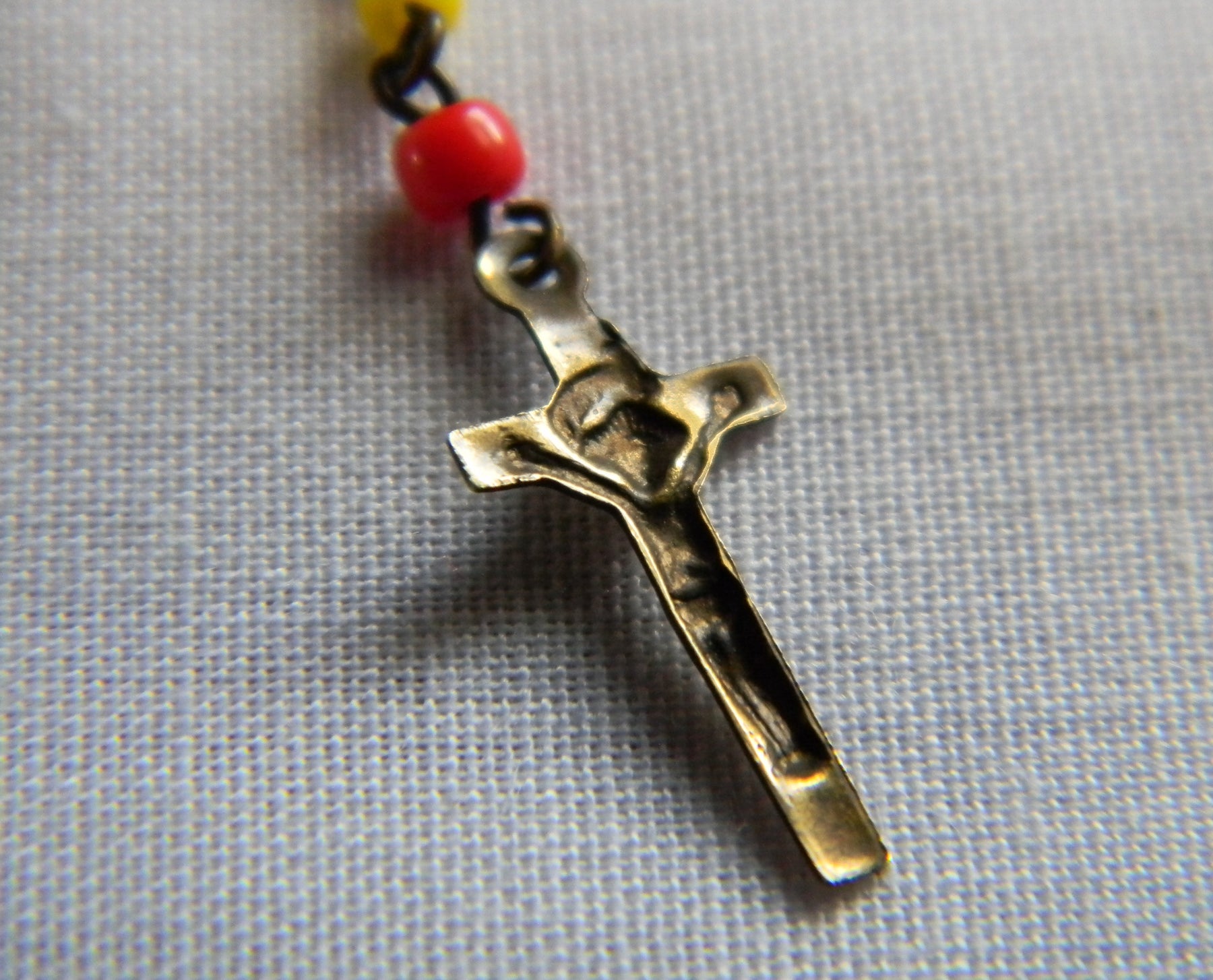 This is a set of vintage Rosary. One is regular size with red plastic beads and silver tone medals and cross. The other one is a pocket rosary with yellow and red seed beads and a crucifix at the end. They do come in a white vinyl zippered pouch. The pouch does show some staining.