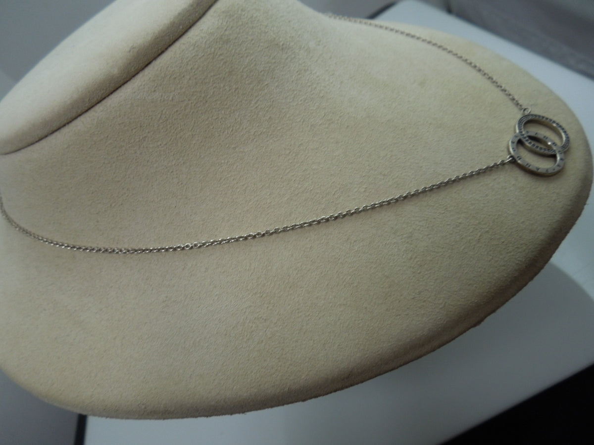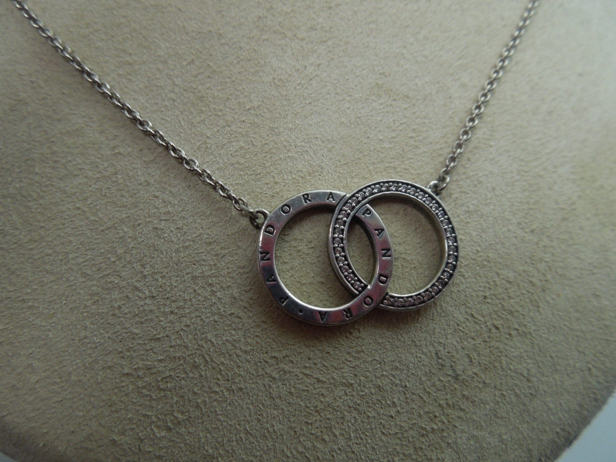 This is Authentic Sterling Silver Dual O Pendant Pandora Necklace 18".Make a bold statement of love with this Sterling Silver Necklace Set. Featuring our DualO Pendant on our classic Chain Necklace, this set is the perfect backdrop for your unique edit of charms. It is a unique beauty! Please see pictures for more details!