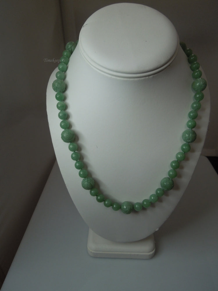 For Sale: (1) q251 Vintage Carved Green Aventurine 19" Long with 9 Carved Beads Necklace