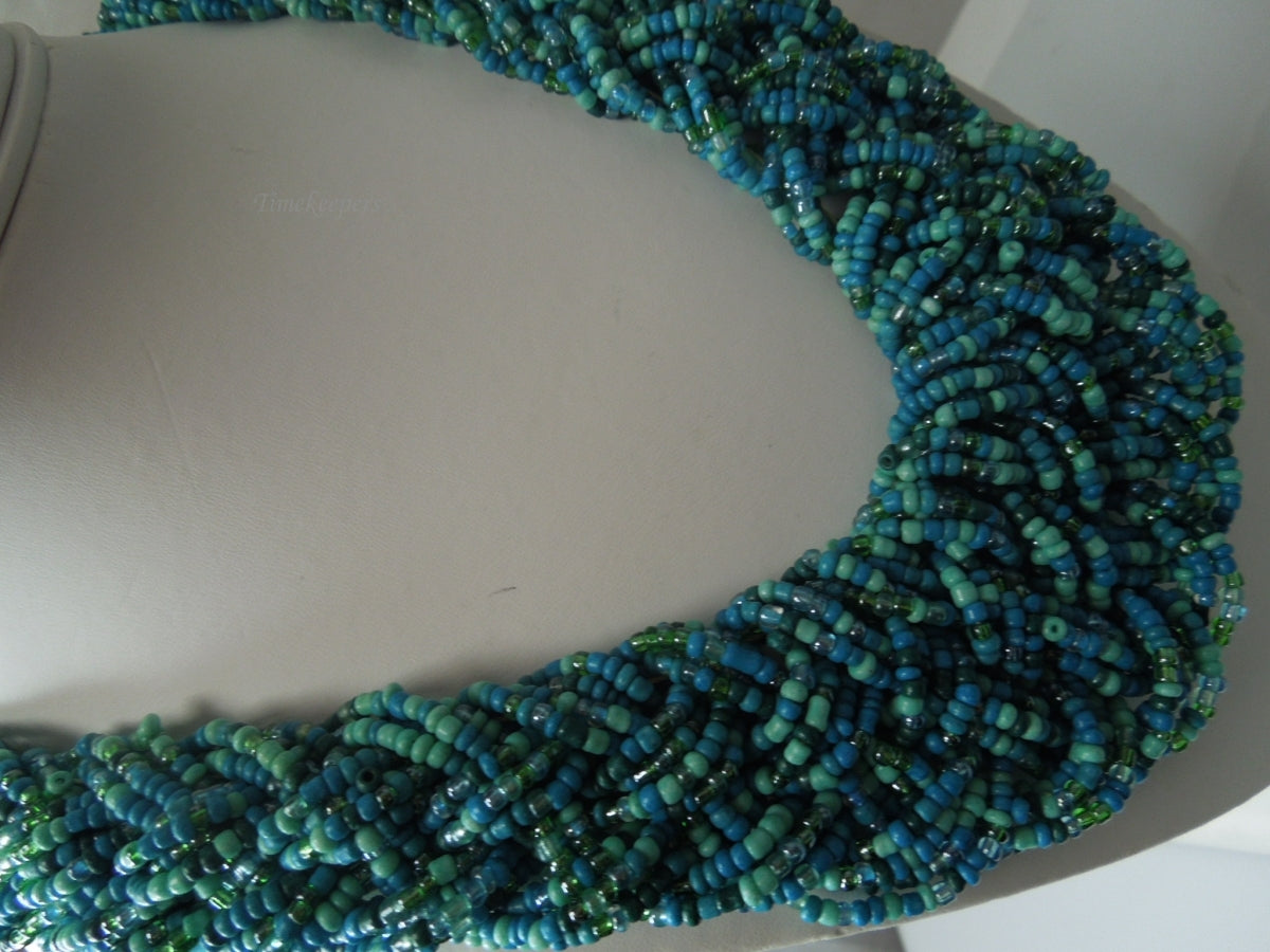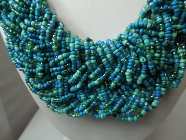For Sale(1) : q296 Vintage Blue Seed Bead Multi Strand Twist Weave Braid Choker Necklace 18" Long (Hand Made Necklace)