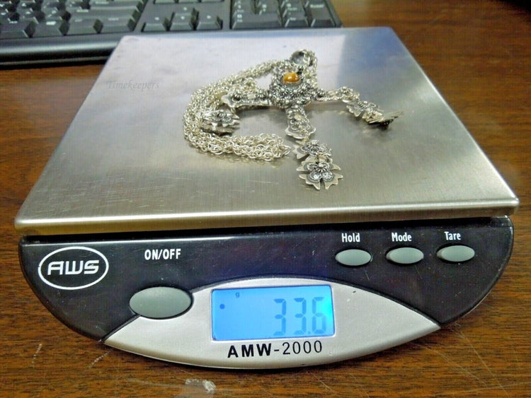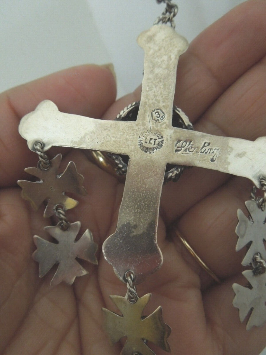 r708 Vintage 1940s Sterling Silver TIGER EYE YALALAG Etruscan 4" Cross Pendant Silver Chain Necklace 32"