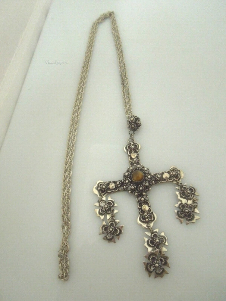 For Sale: (1) r708 Vintage 1940s Sterling Silver TIGER EYE YALALAG Etruscan 4" Cross Pendant Silver Chain Necklace 32"
