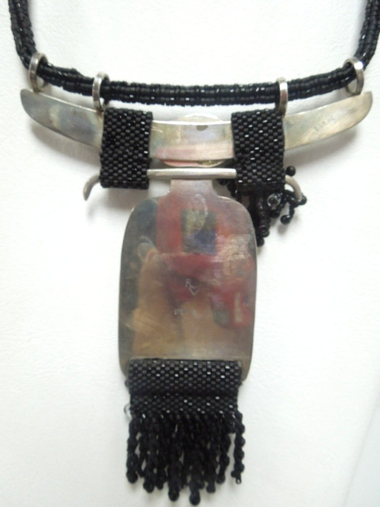 It is made with a whole fossil Trilobite ( measuring roughly 1.75 inches top to bottom), set into sterling silver and strung from an 15 inch (approx.) black beaded string.