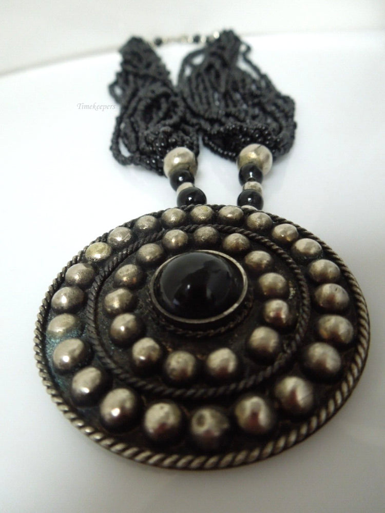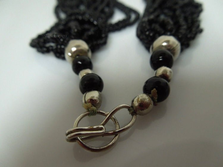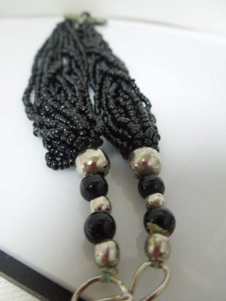 For Sale (1): t065 Vintage Black Seed Bead Waterfall Round Pendant Necklace Multi Strand Boho Silver Tone Clasp 20"