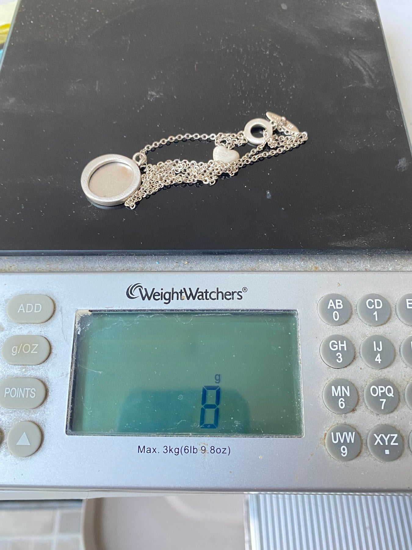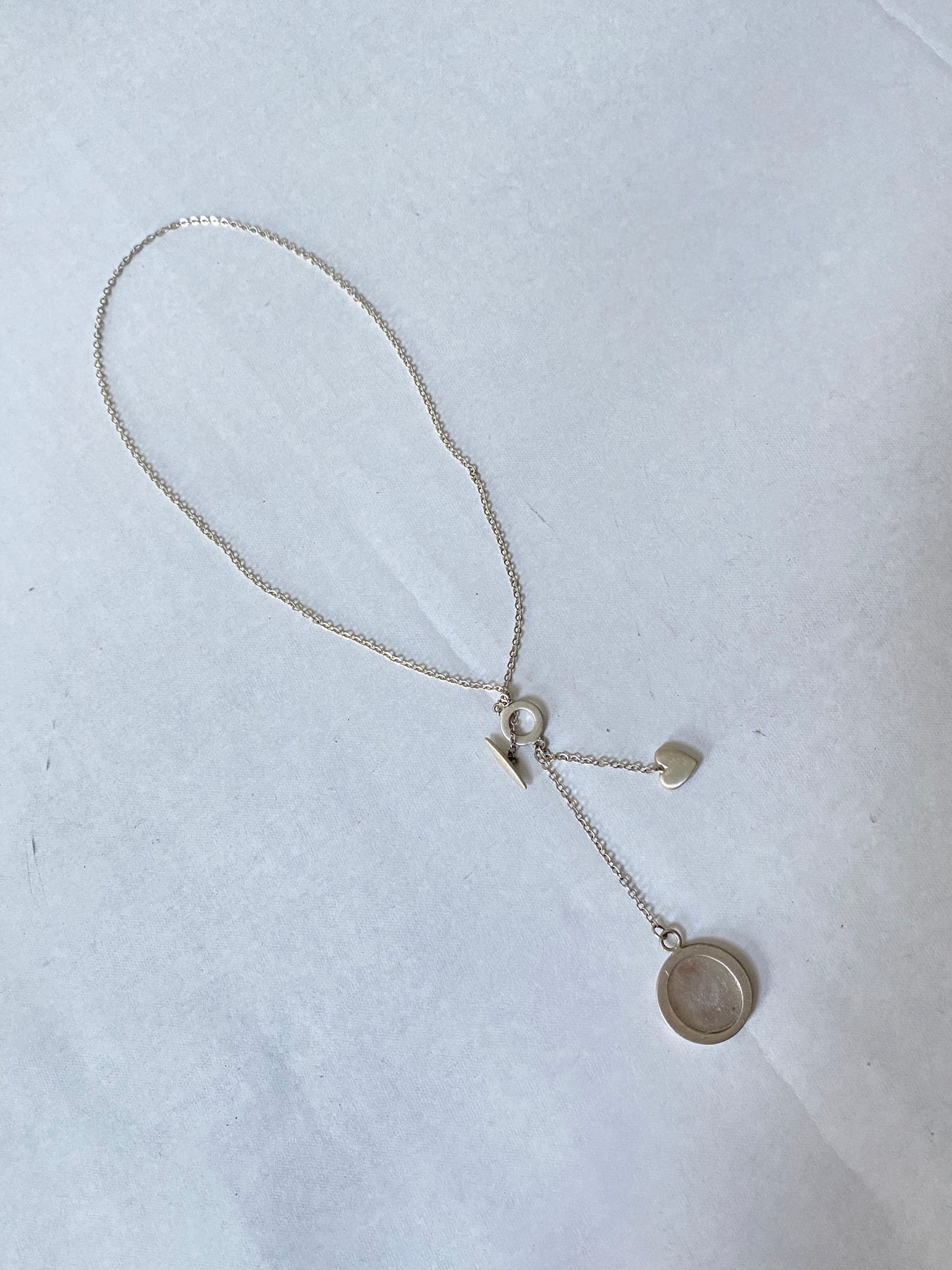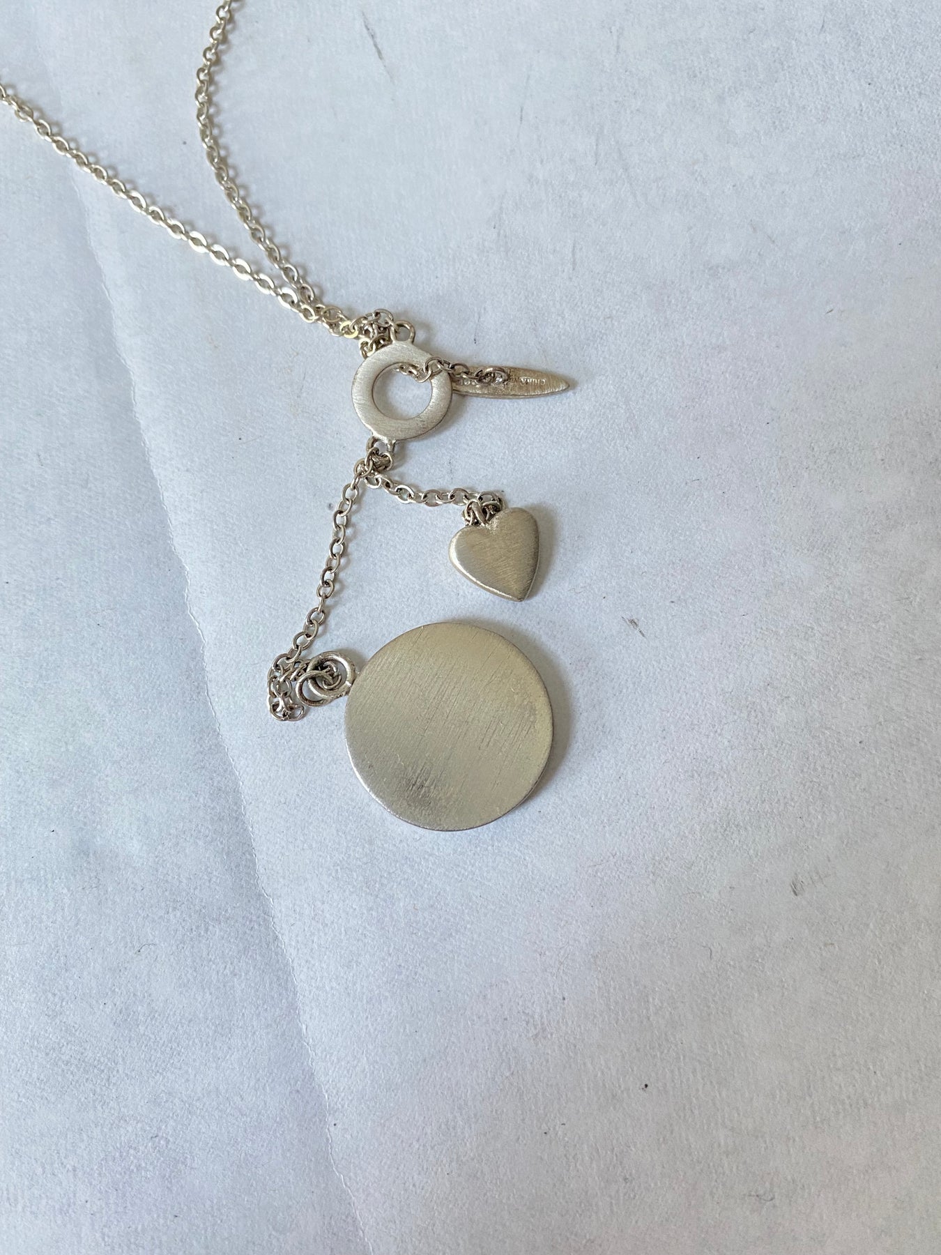 * Sterling Silver Pendants. 1- Round pic frame (20mm in diameter) with top slit on 2" chain; 2-Heart shaped pendant (9mm x 9mm) on 1" chain.