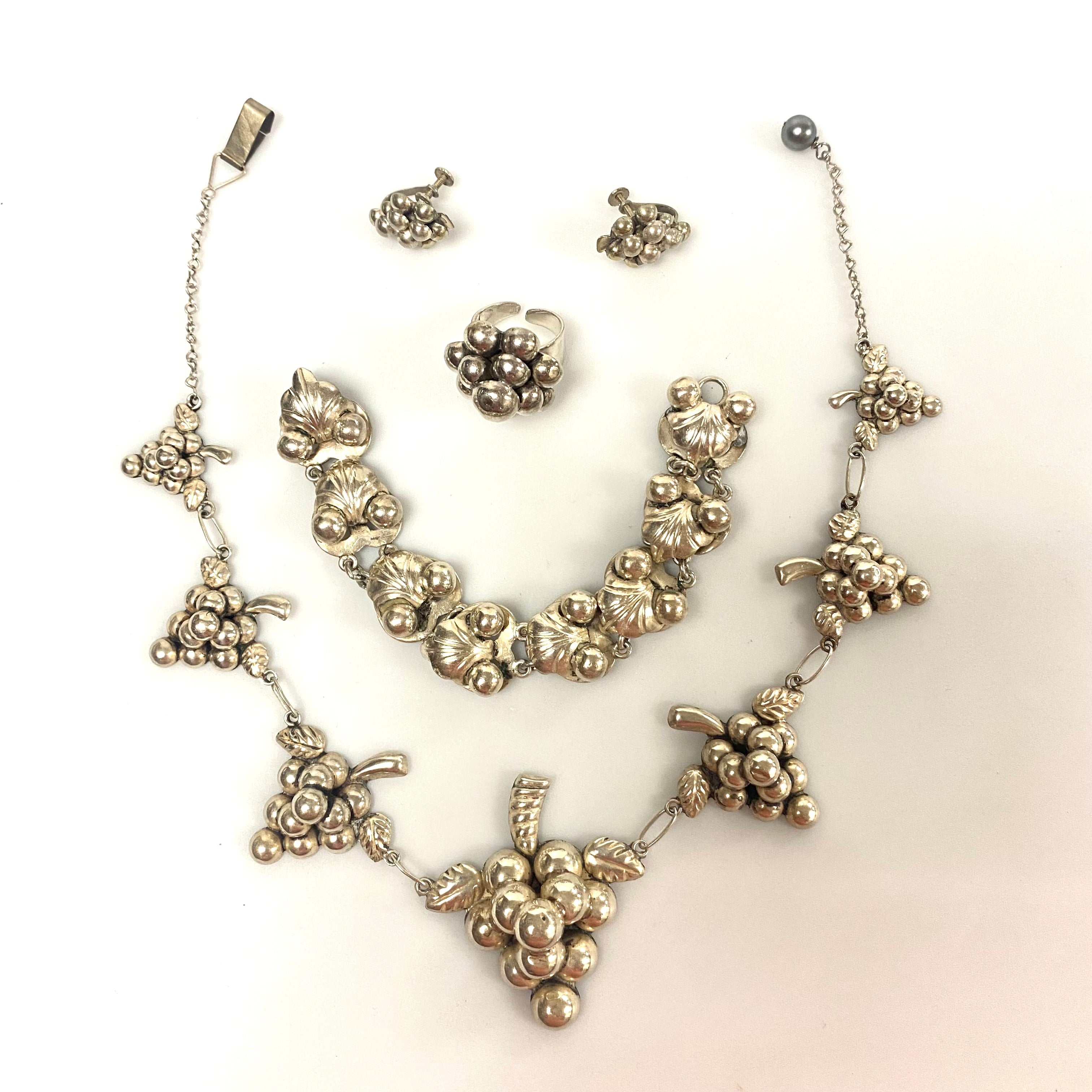 h854 Vintage Sterling Silver Necklace Bracelet Ring Earrings Set Grape Bunch
