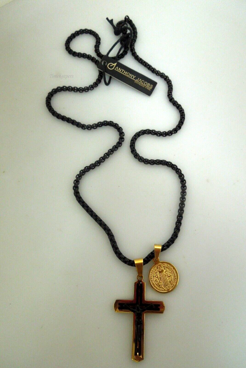 s344 Anthony Jacobs Black Stainless Steel Chain and gold tone round and cross Pendant New with tags