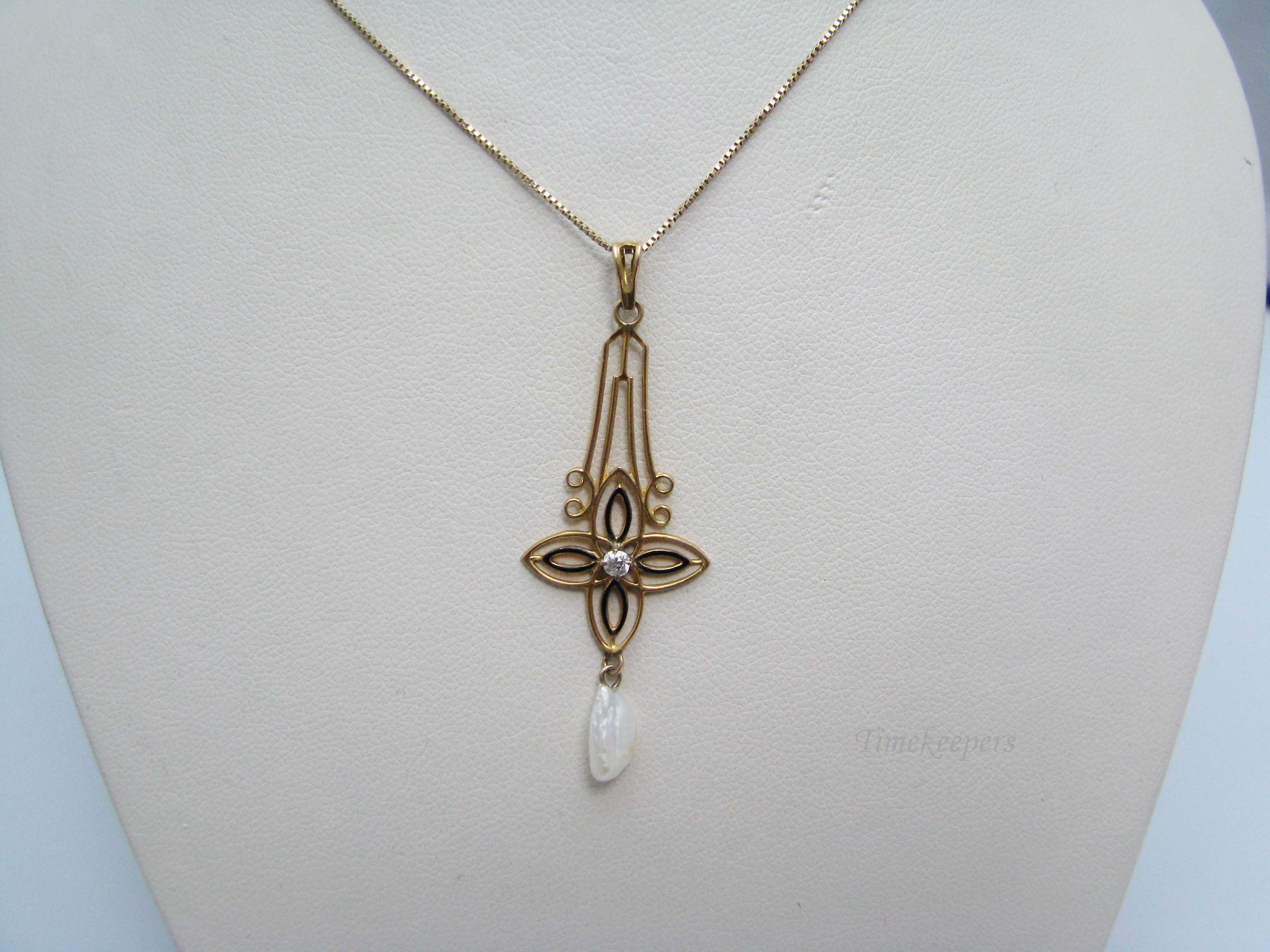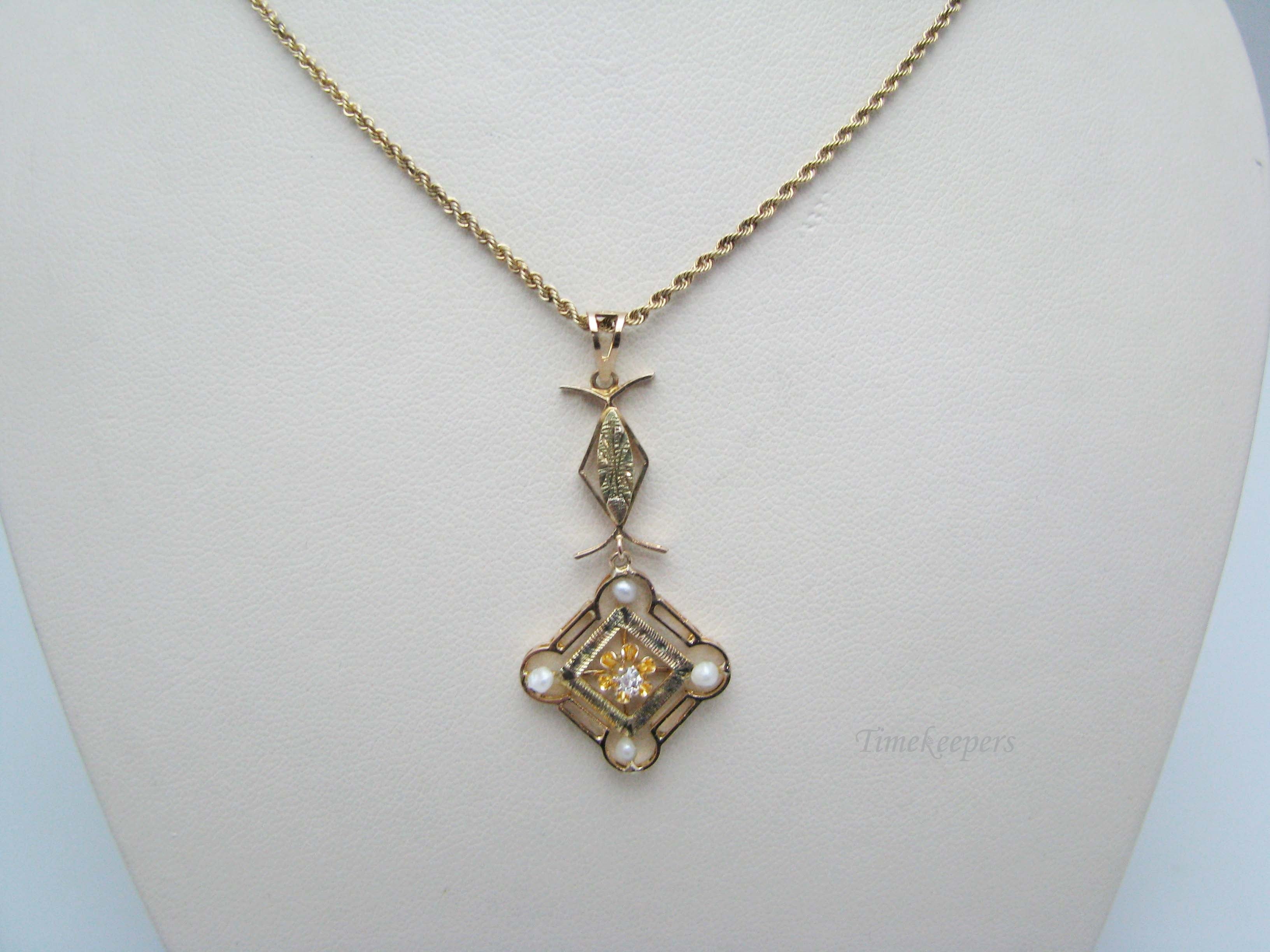 j173 Beautiful Vintage 10k Yellow Gold Diamond Pearl Pendant on 14k Gold Chain