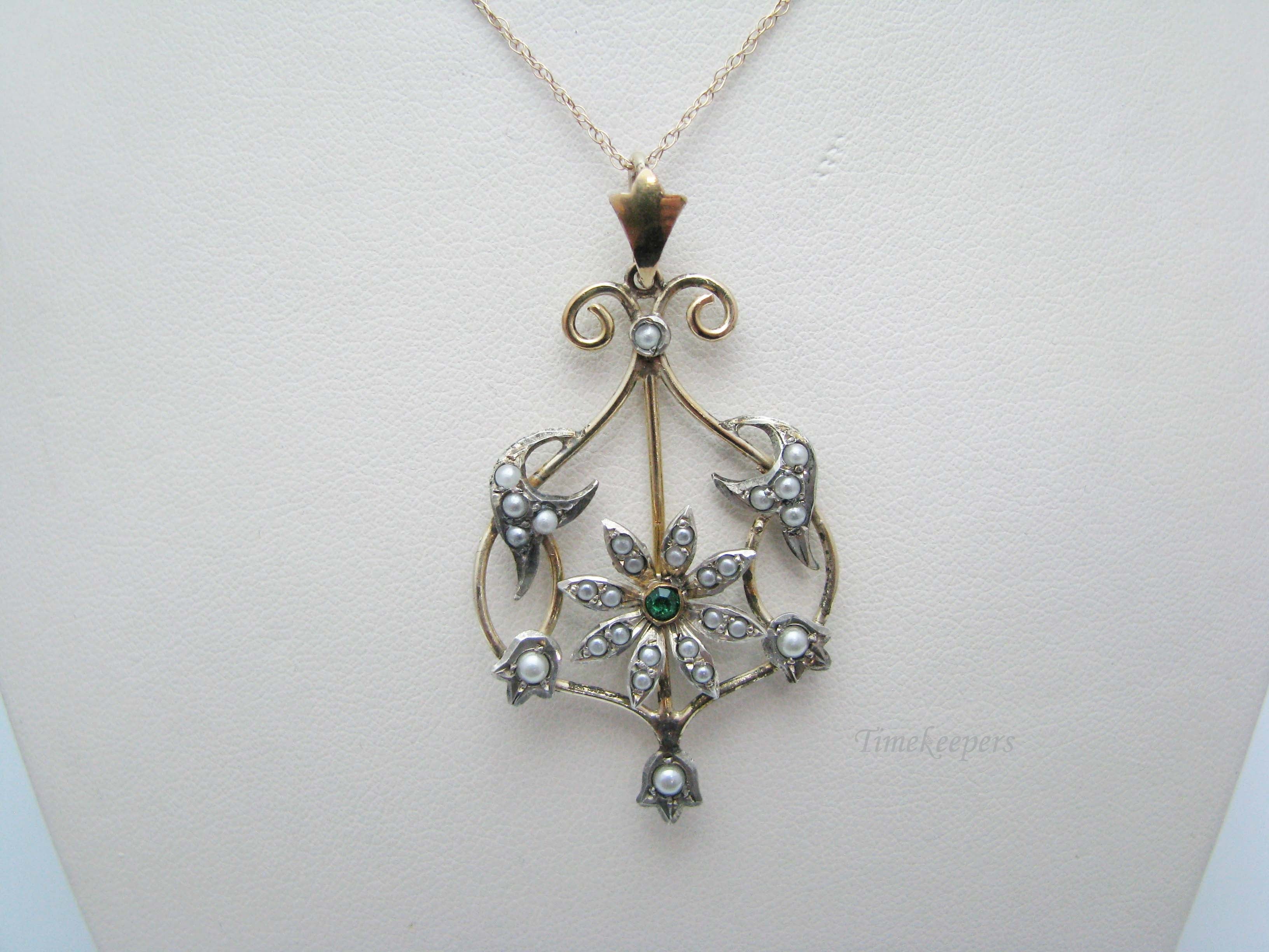 j178 Stunning Vintage 14k Yellow Gold Green Stone and Seed Pearl Pendant