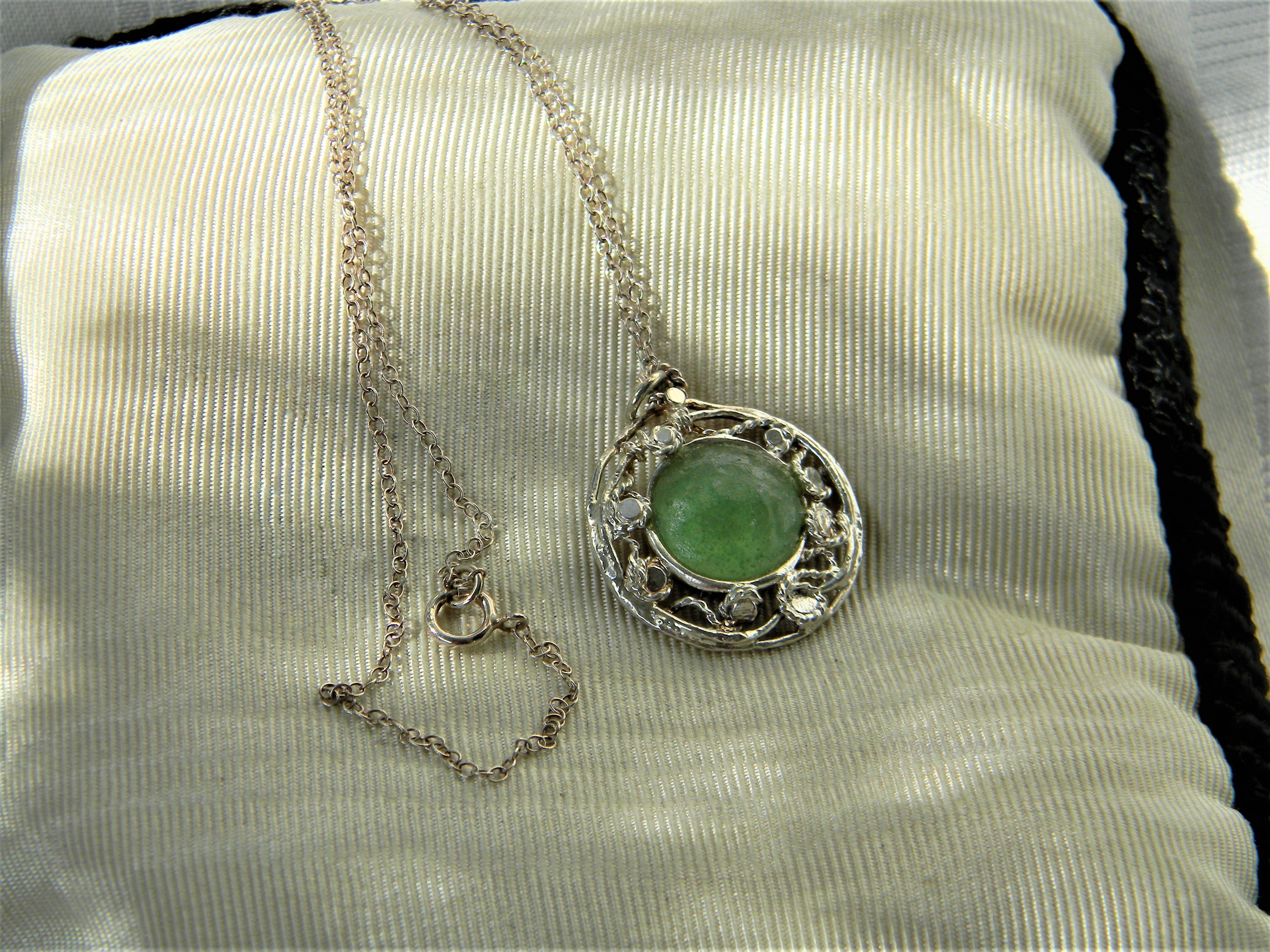 j409 Pretty Retro Sterling Silver Pendant with Green Glass Stone on Chain