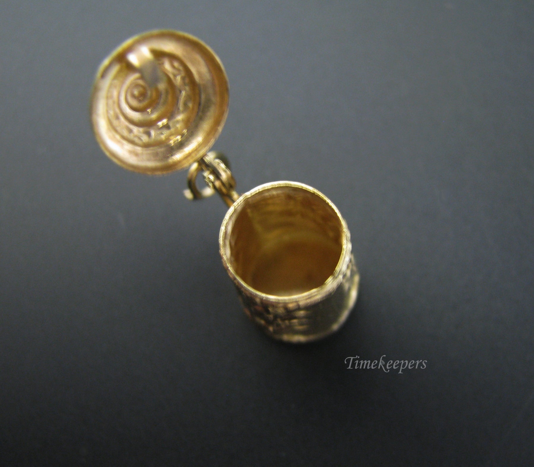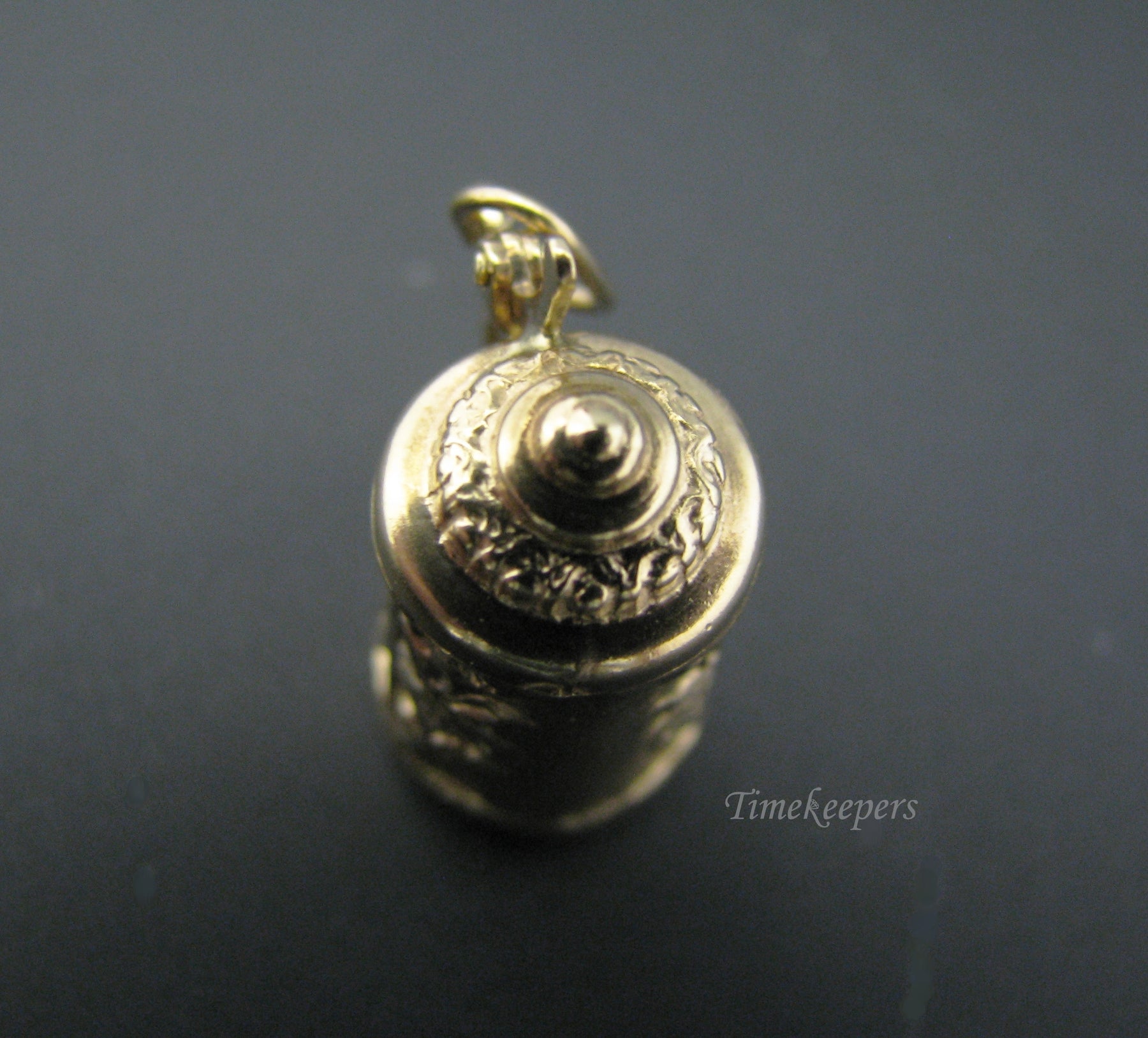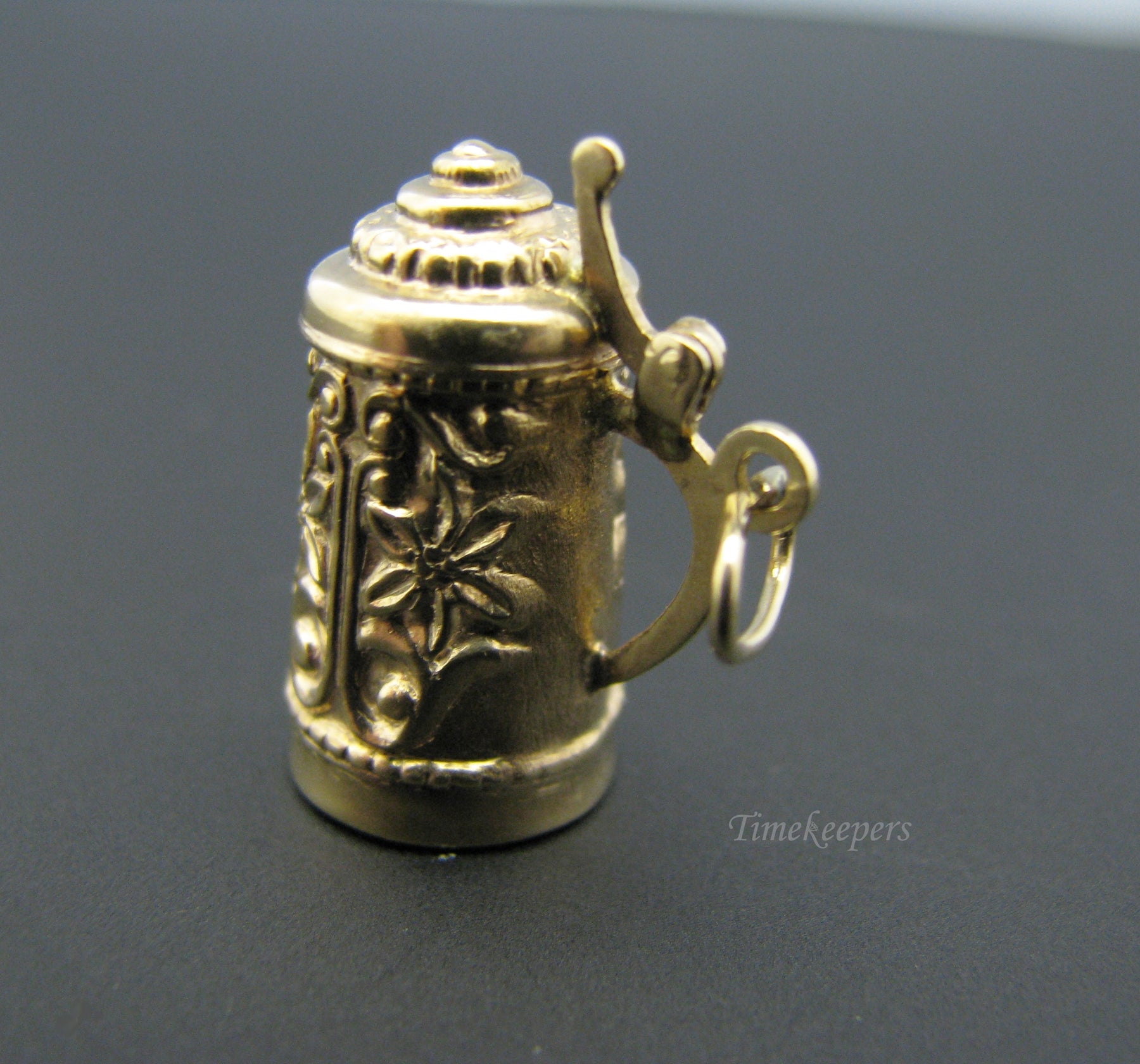 This is a great small 3d German style beer stein in 14K yellow gold. The lid does open as seen in the pictures. The exterior features an embossed finish of flowers.