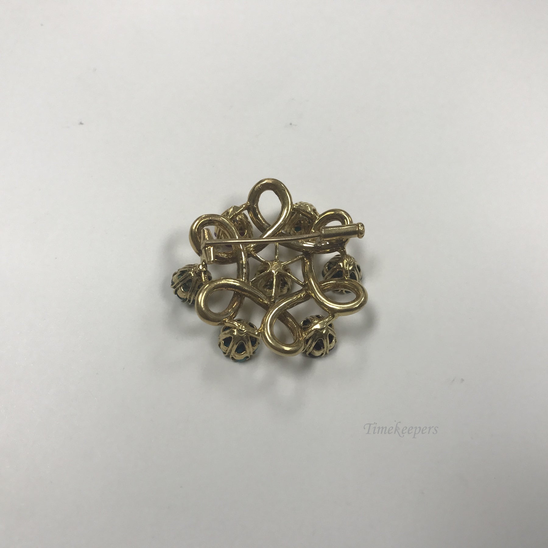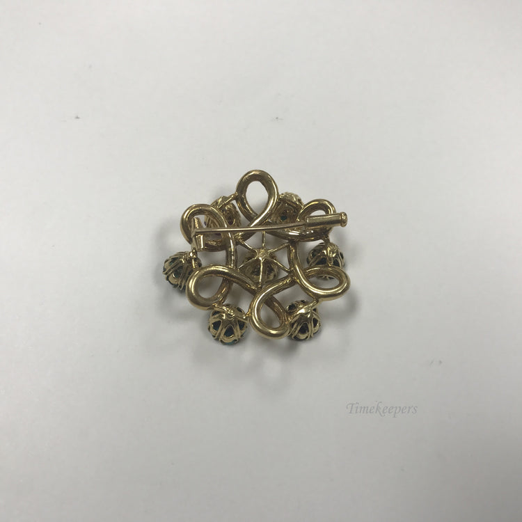 •7 small moving flowers (all flowers move when you walk or shape the brooch), 2 flowers with 6 rubies each (total of 12) 2mm in diameter; 2 flowers with Turquoise, with 6 stones each (12 total, 2mm in diameter; 2 flowers with Green Emeralds, 6 stones in each (12 total), 2mm; one center flower with 6 white sapphires, 2mm in diameter.