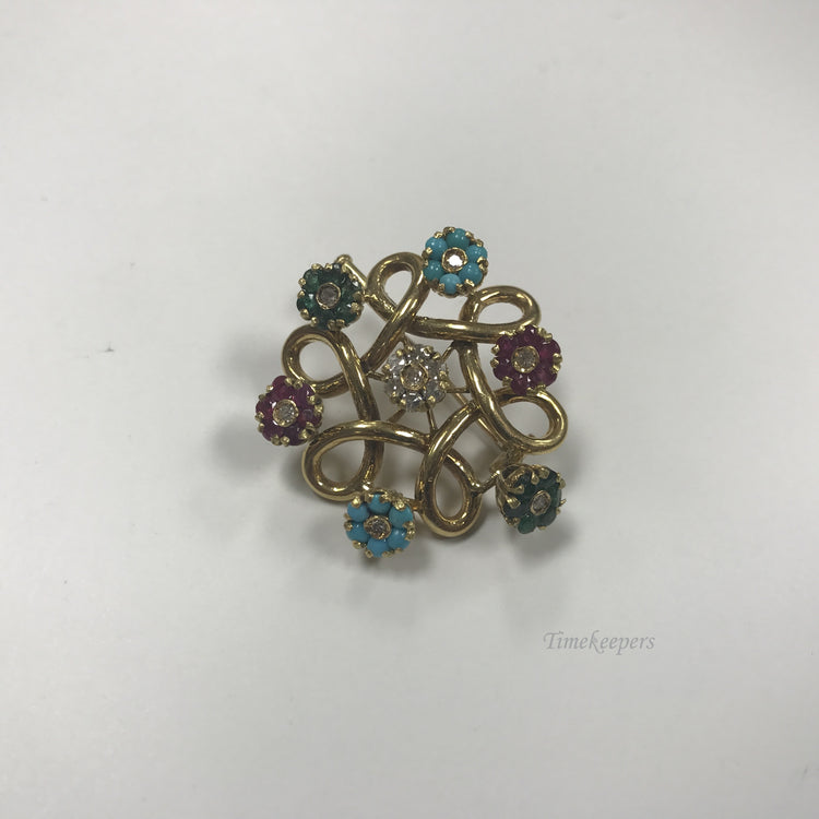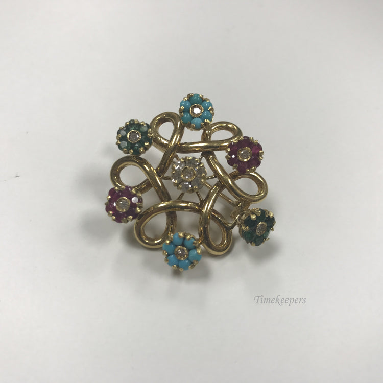 d090 Antique 18k Yellow Gold Flower Brooch Emerald Ruby Sapphire Turquoise Stone