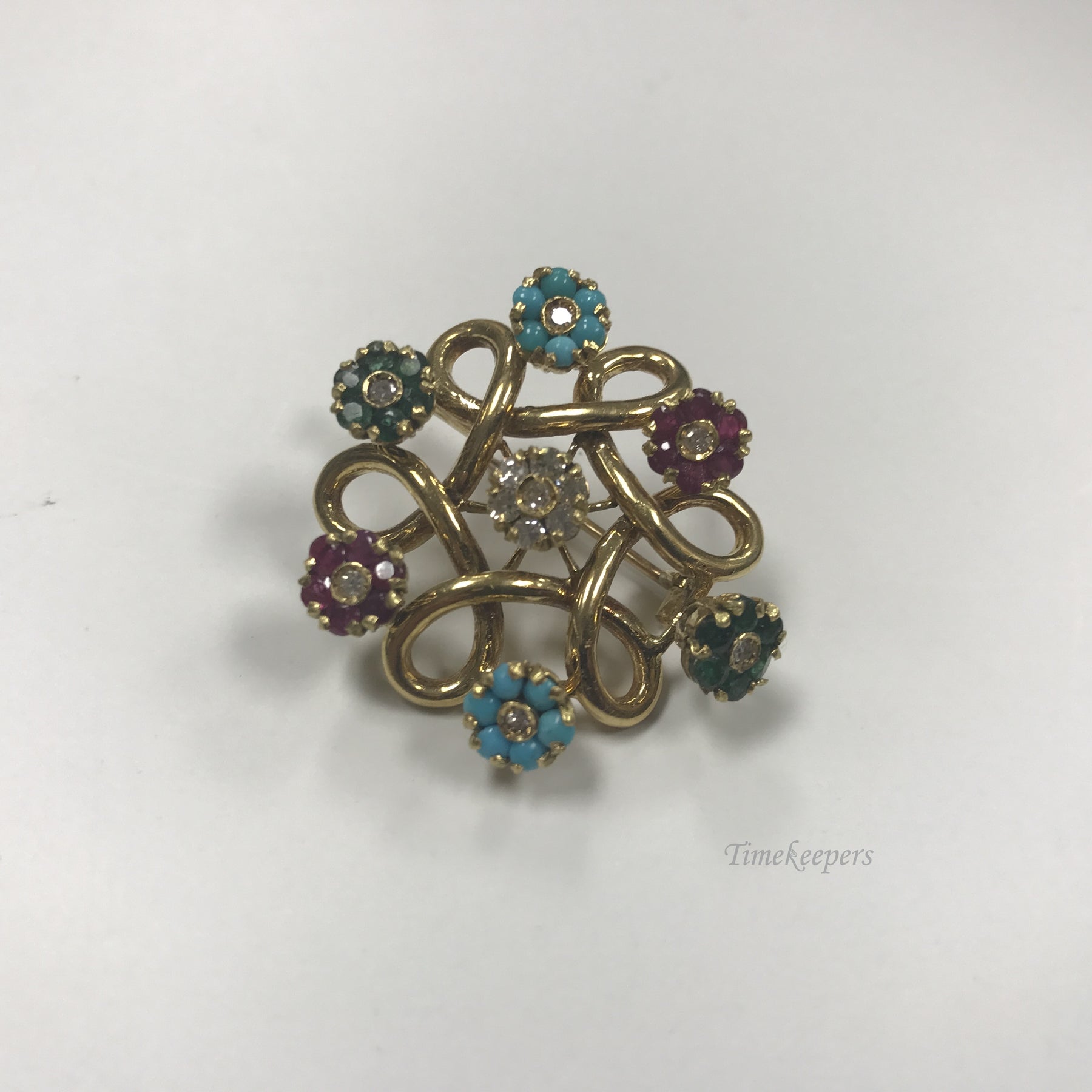 For Sale: (1) d090 Antique 18k Yellow Gold Flower Brooch Emerald Ruby Sapphire Turquoise Stone