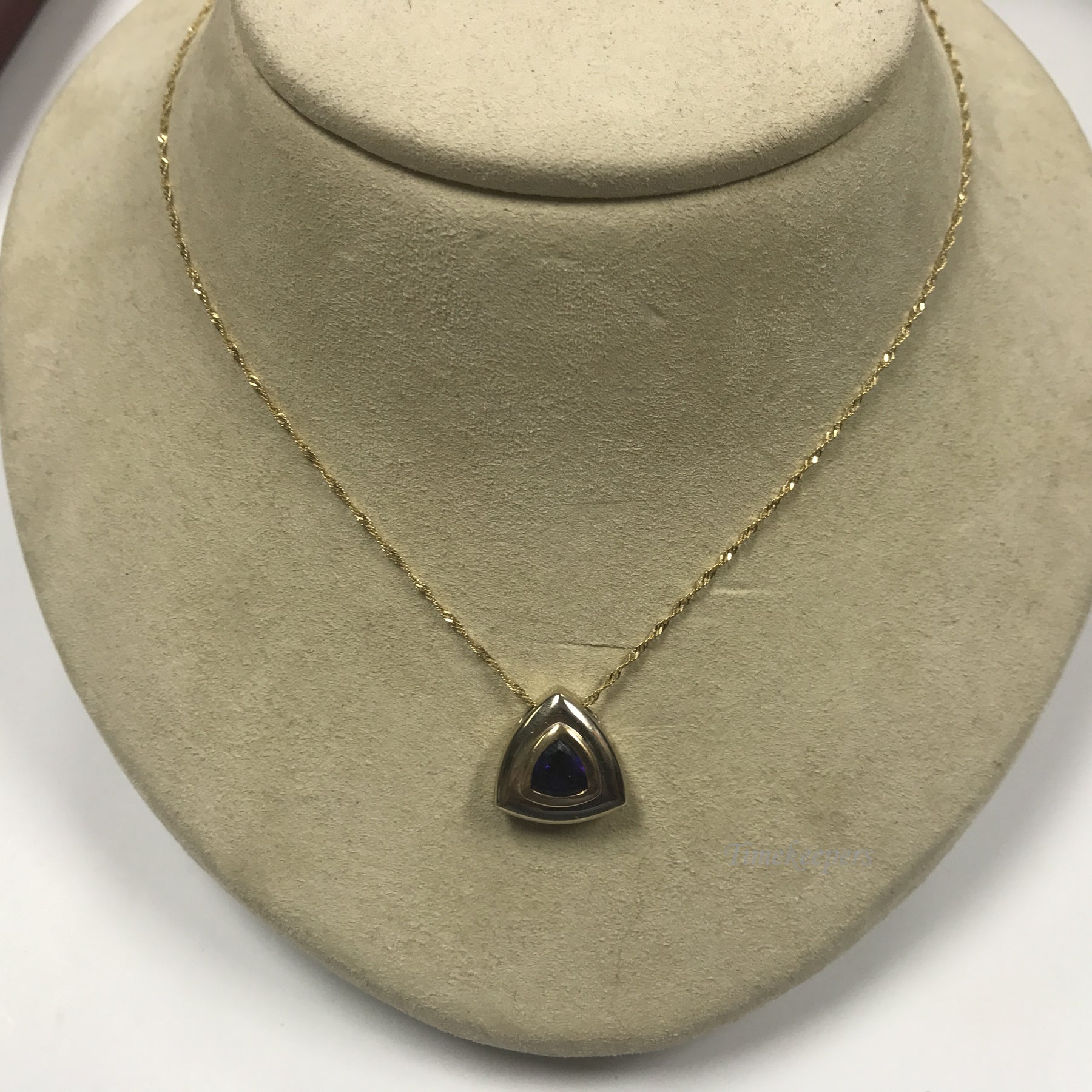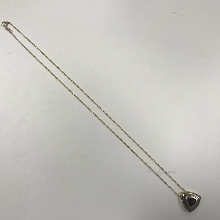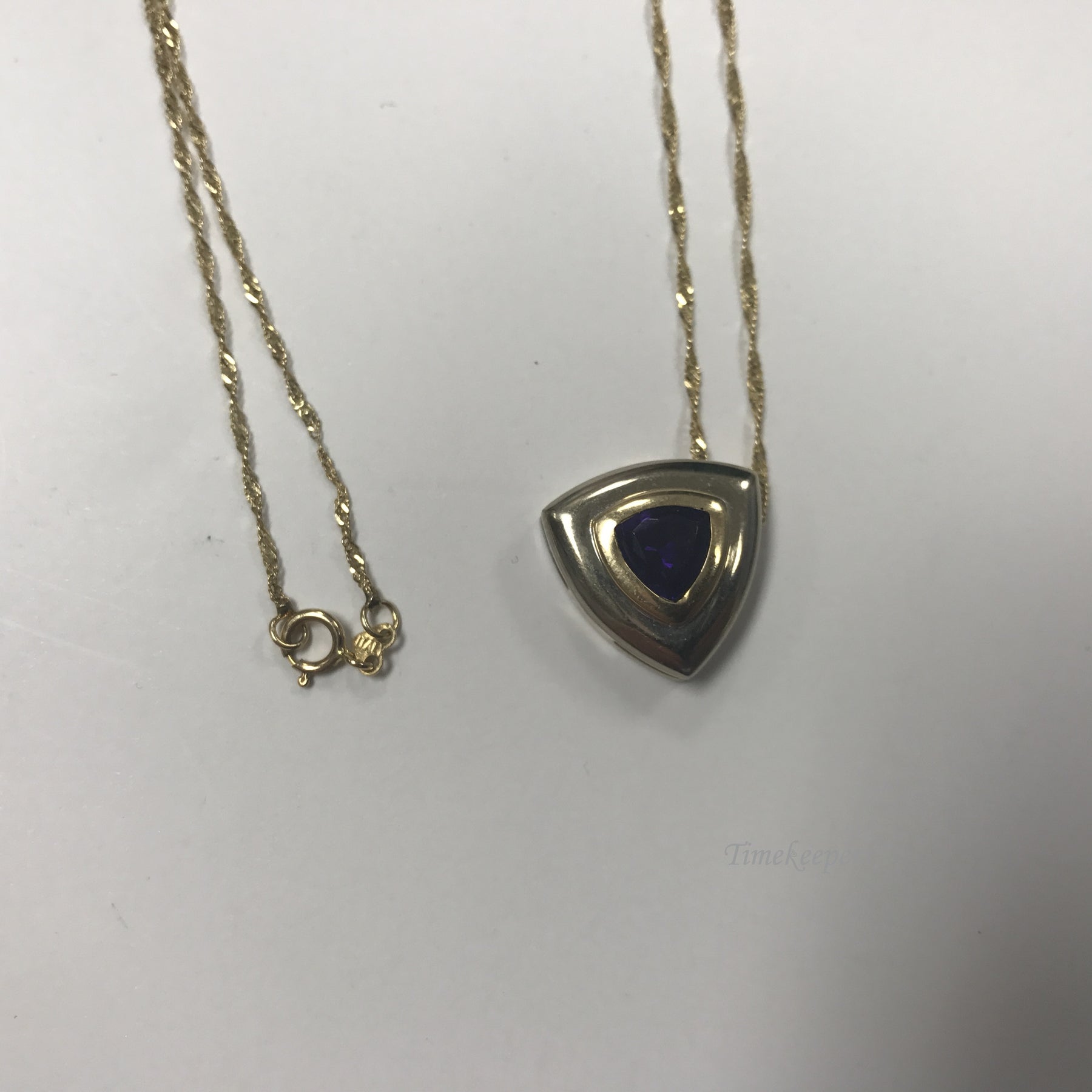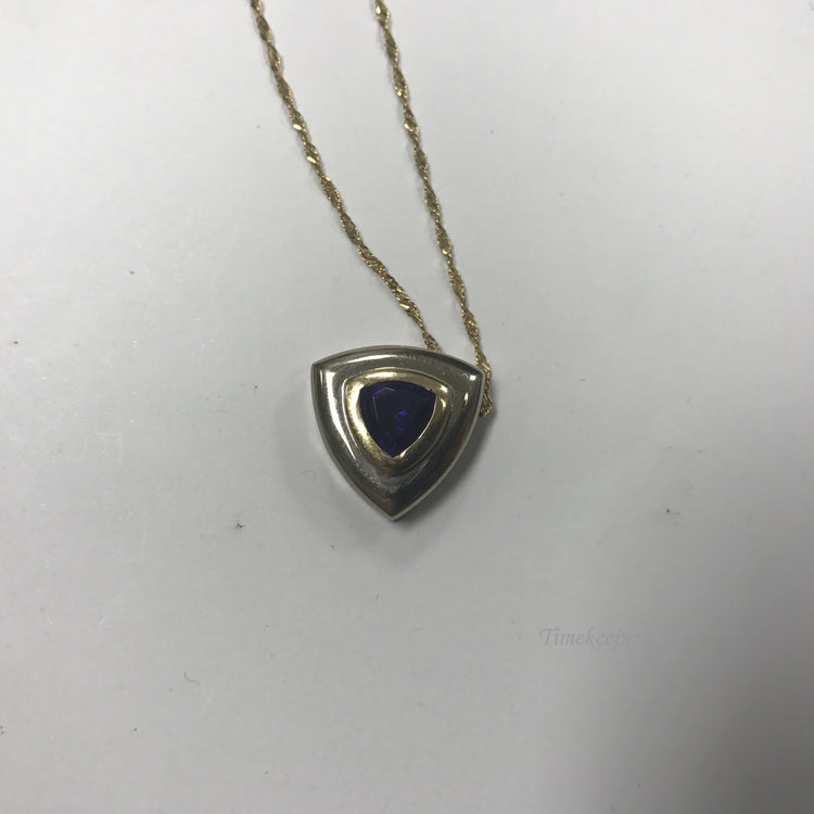 Pendant is in a triangle shape in two-tone yellow and white gold (stamped 14k) with amethyst stone in the center. Pendant is approx 15 top to bottom, 15mm side to side.