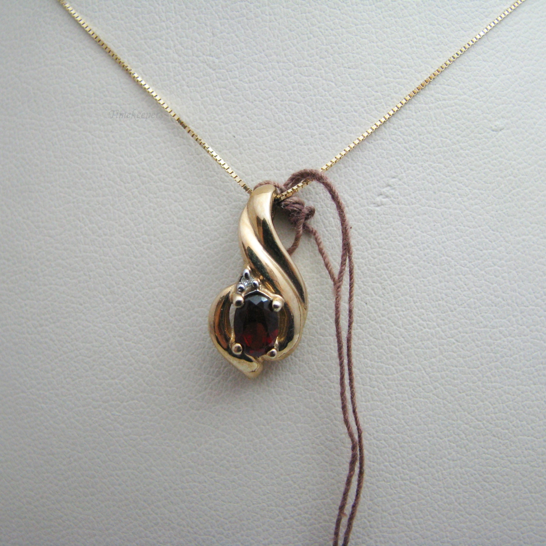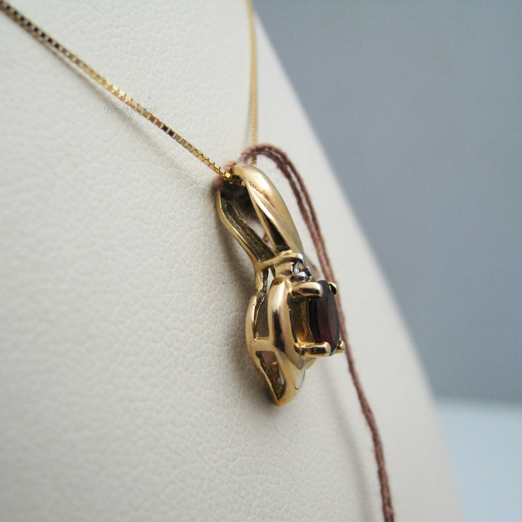 This pendant contains one red stone centerpiece and one small diamond. It is stamped. This pendant does not come with a chain/necklace, but a chain can be purchased separately if desired.