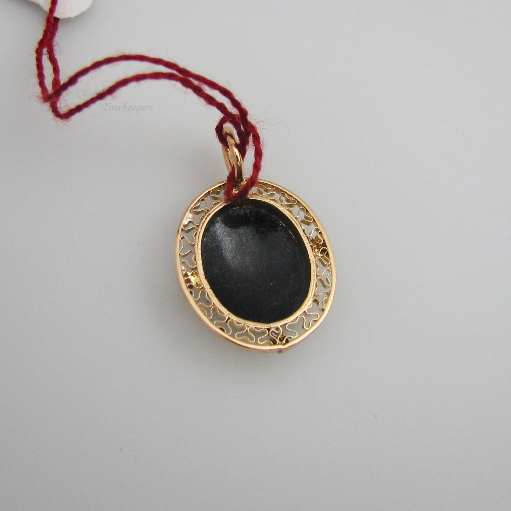 This pendant contains the painted portrait of a woman, framed by fine filigree detailing. It is not stamped, but has been tested for authenticity.