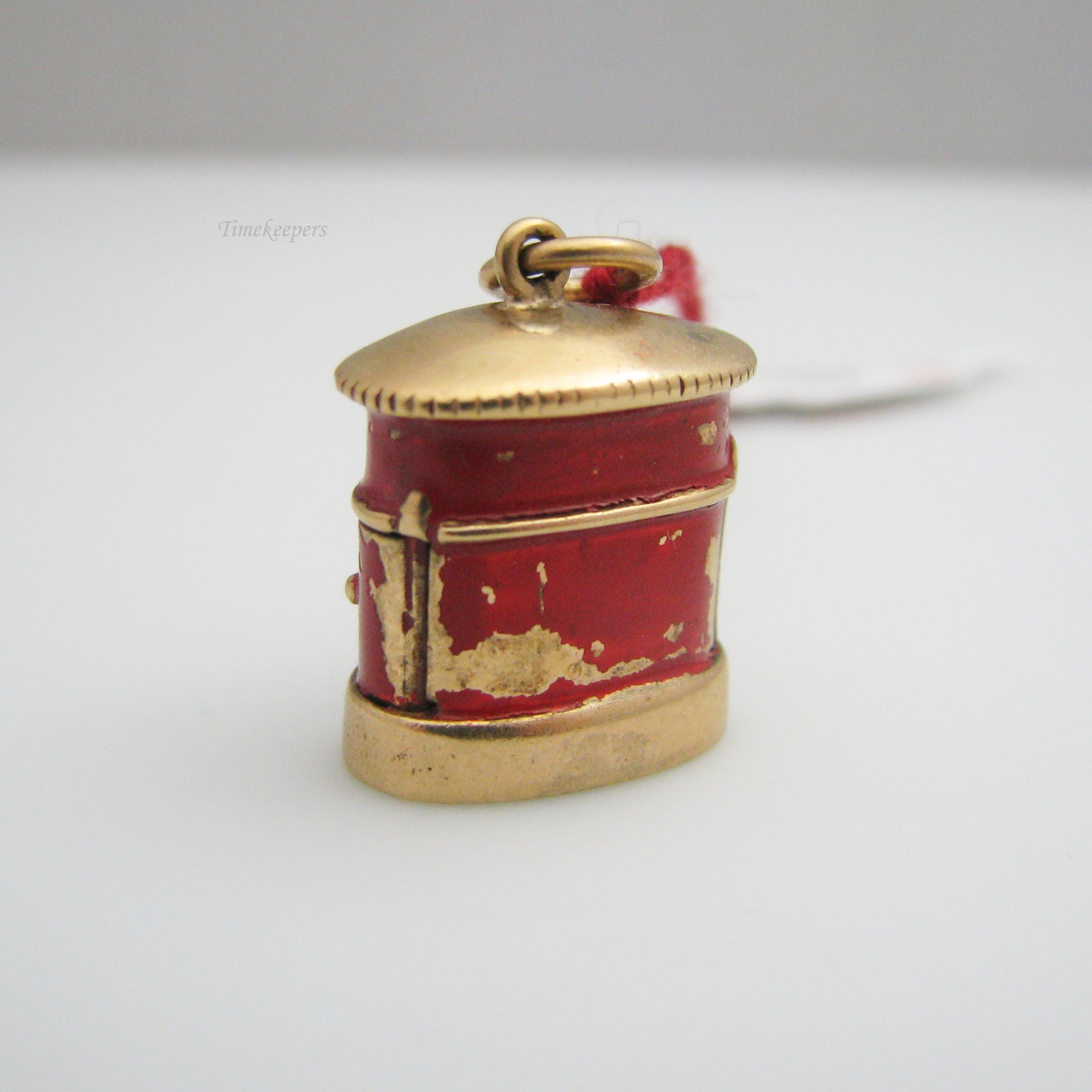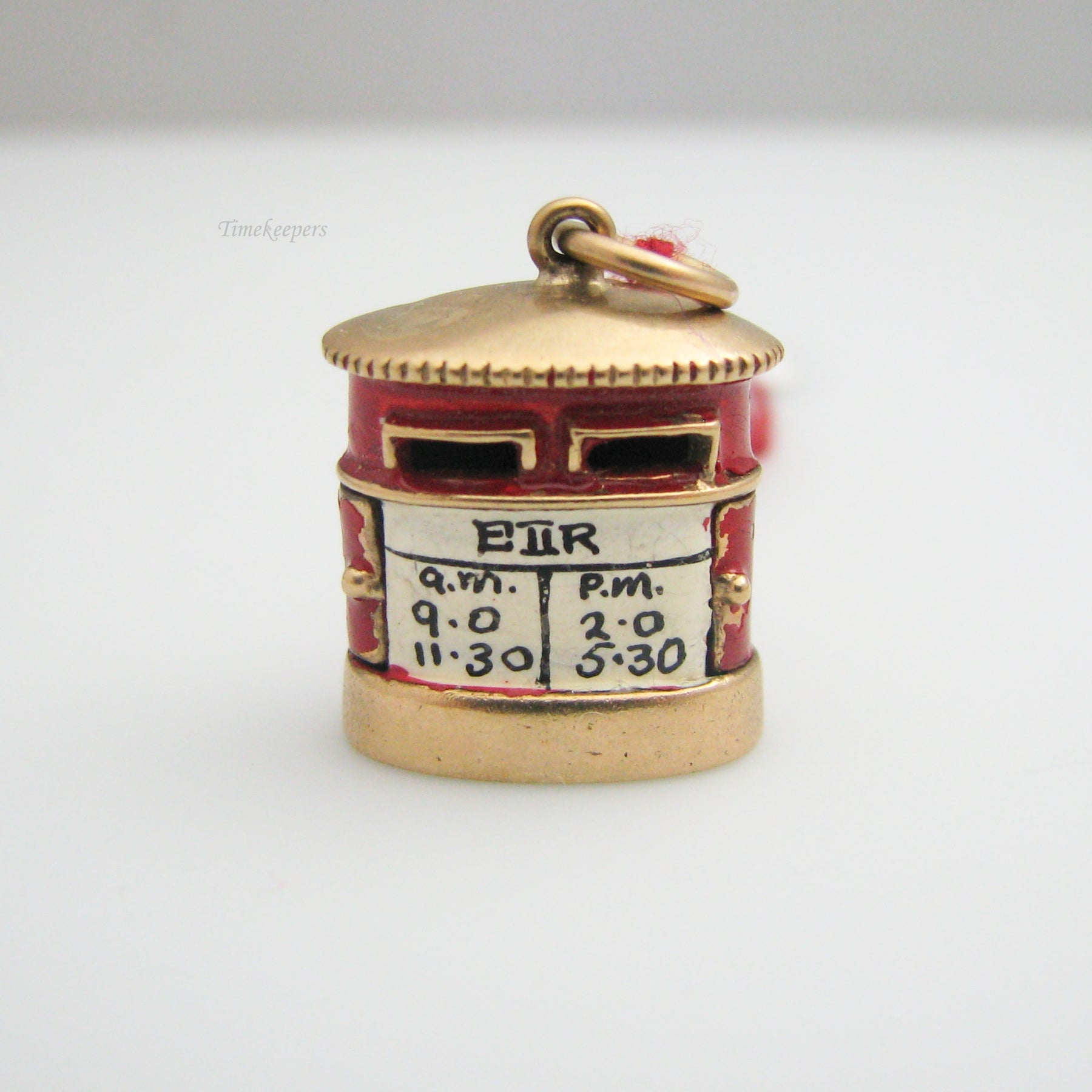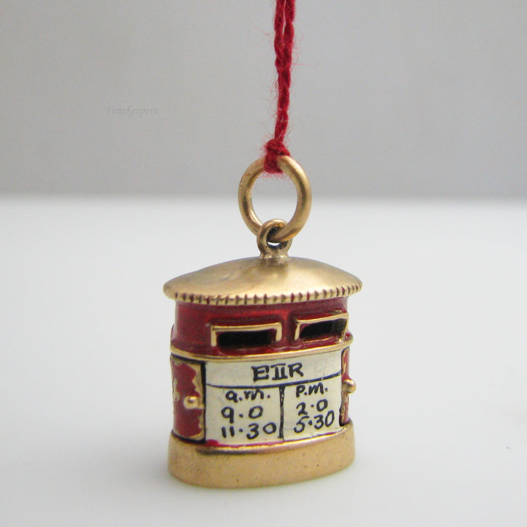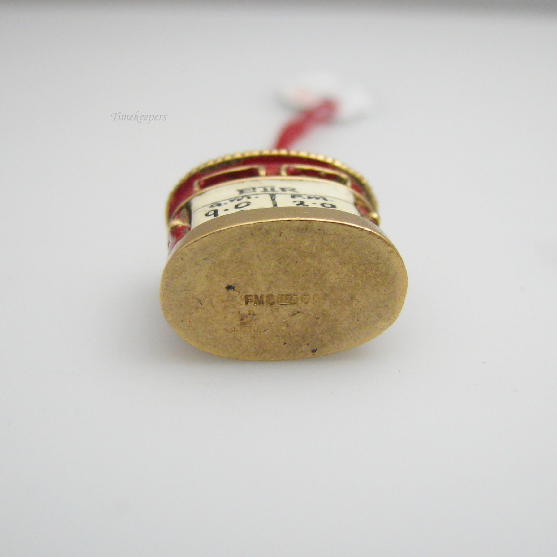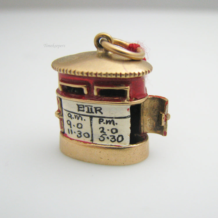This pendant depicts a train station and train arrival times. It is painted red, but the natural gold color can be seen in the details of the piece. It is stamped.