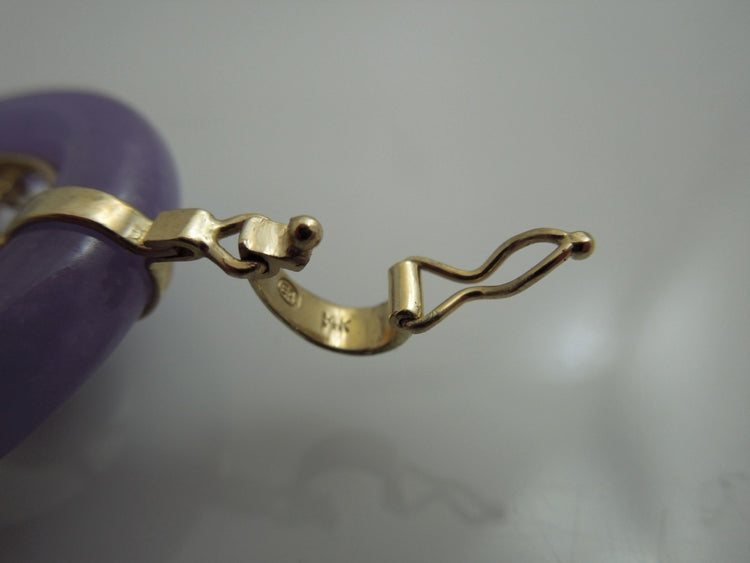 This is a gorgeous lavender jade piece. A beautiful Amethyst rose, with 14kt petals, sits inside the lavender Jade. On two of the petals, are 2 small round cut diamonds. It also features a figure 8 clasping bail. Bail and back of flower are stamped 14k. Perfect for a night on the town or a special occasion. Would be a nice anniversary, birthday, Christmas, Mother's Day or Valentine's Day gift for her.