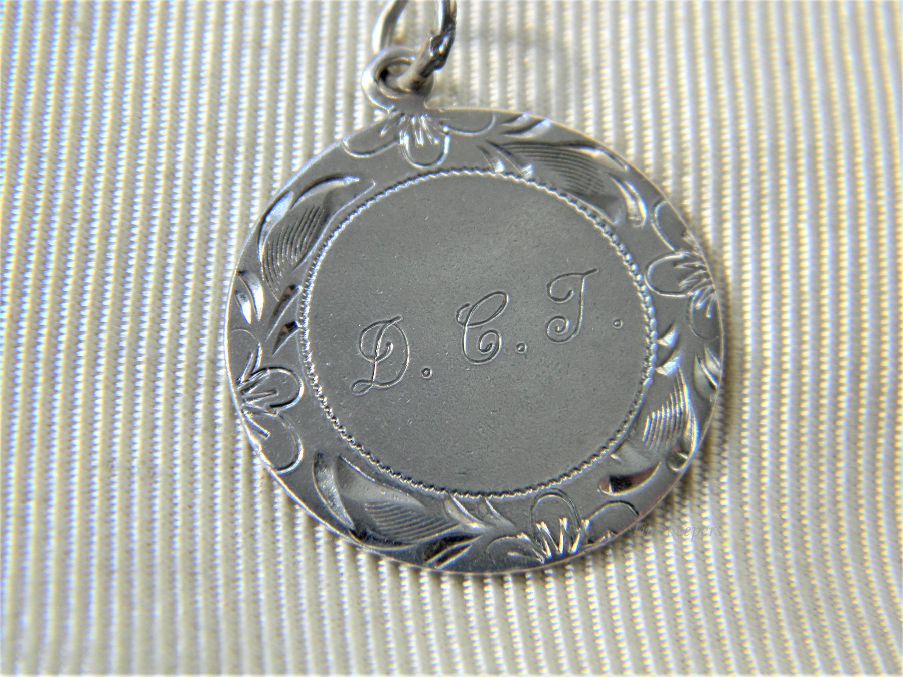 For Sale: Pretty Vintage Sterling Silver Engraved Round Charm/ Pendant PLEASE READ ENTIRE DESCRIPTION BEFORE PURCHASING Pre-owned vintage item. Good condition. Small scratches from wear and age. Please see pictures for details. Sold as is, as seen on pictures. Engraved DCT. Specifics: