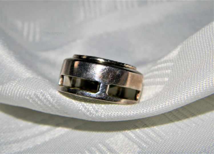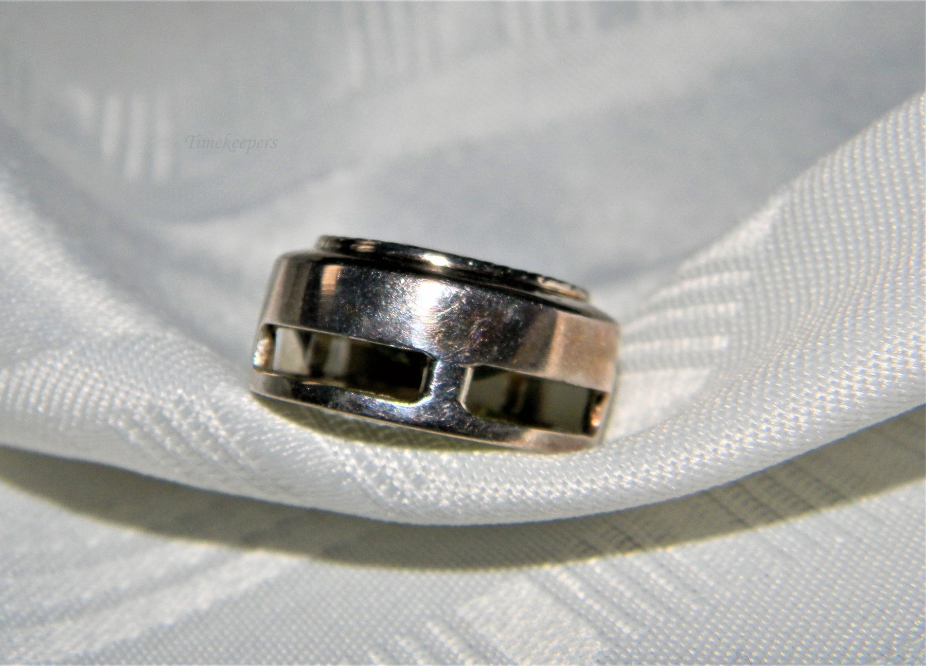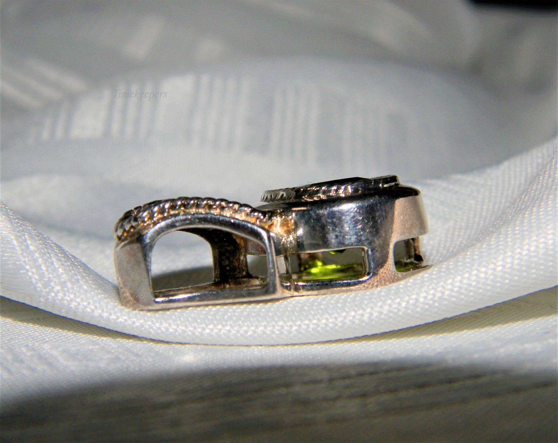 This beautiful piece features several an oval green stone with a twisted silver frame. This piece does show some tarnish.