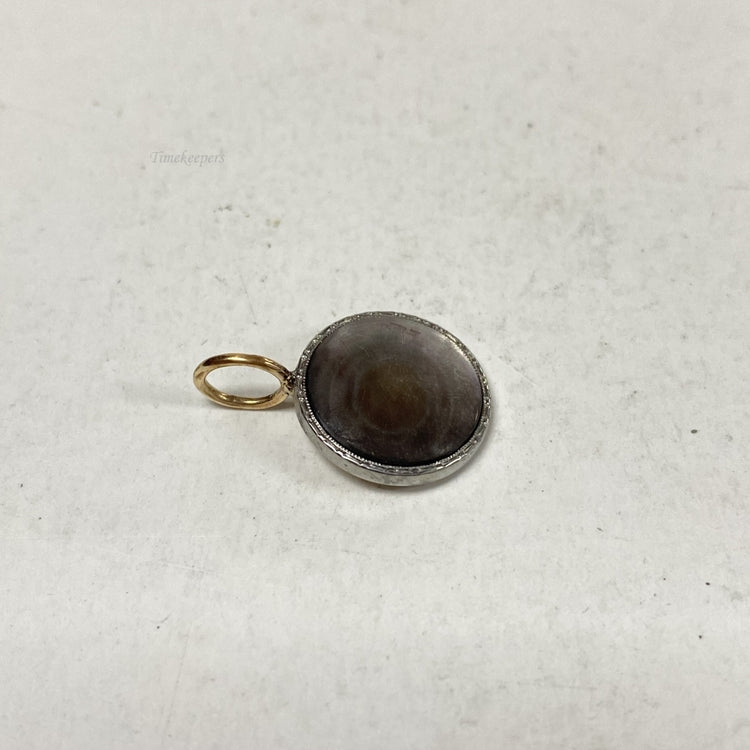 • Sterling silver pendant. Silver frame with Dark Silver Mother of Pearl(11mm in diameter) in center. Gold and silver tone.