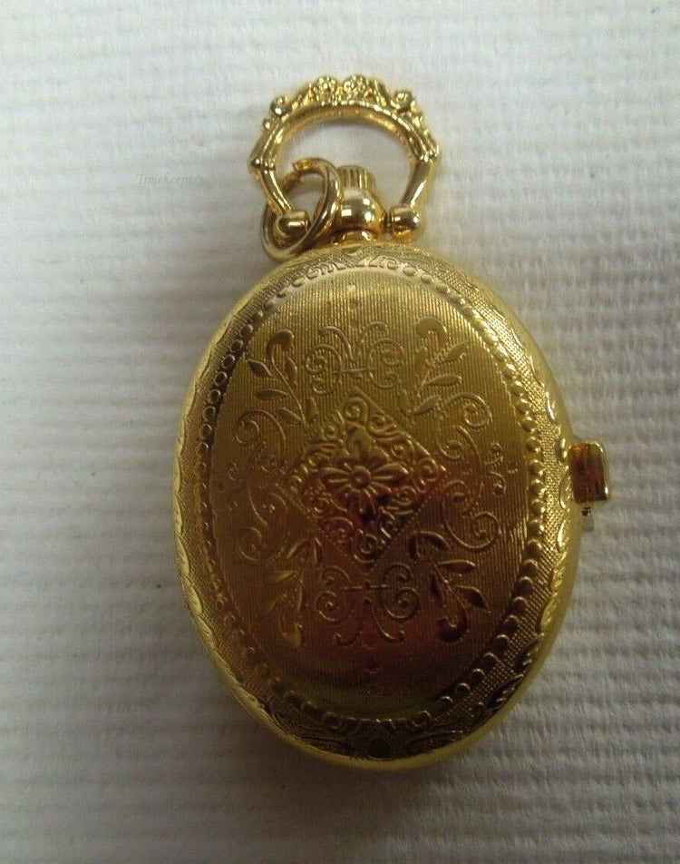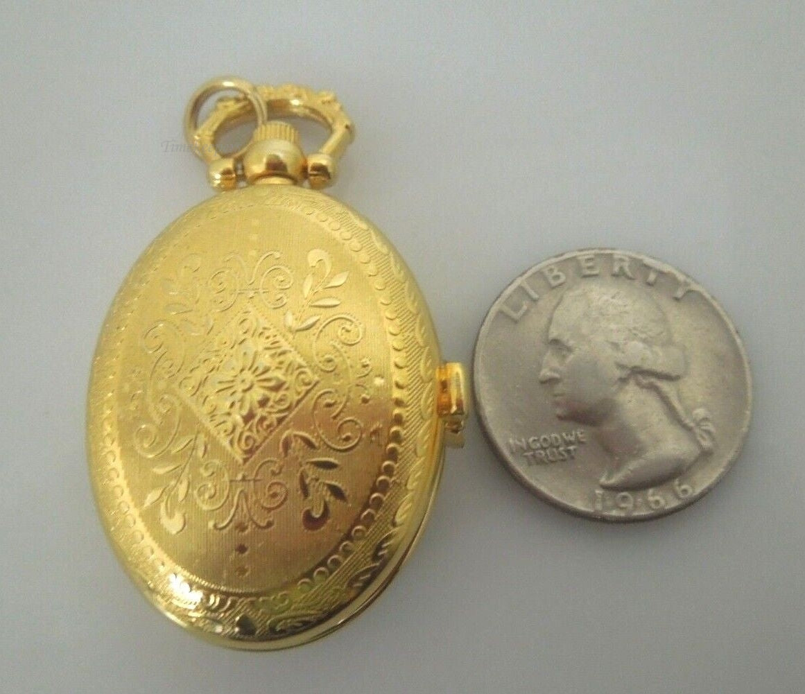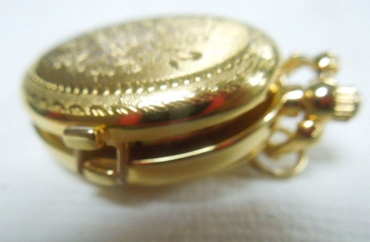 For Sale: (1) r867 Vintage Oval Etched Quartz Clock Gold tone Pendant Rare
