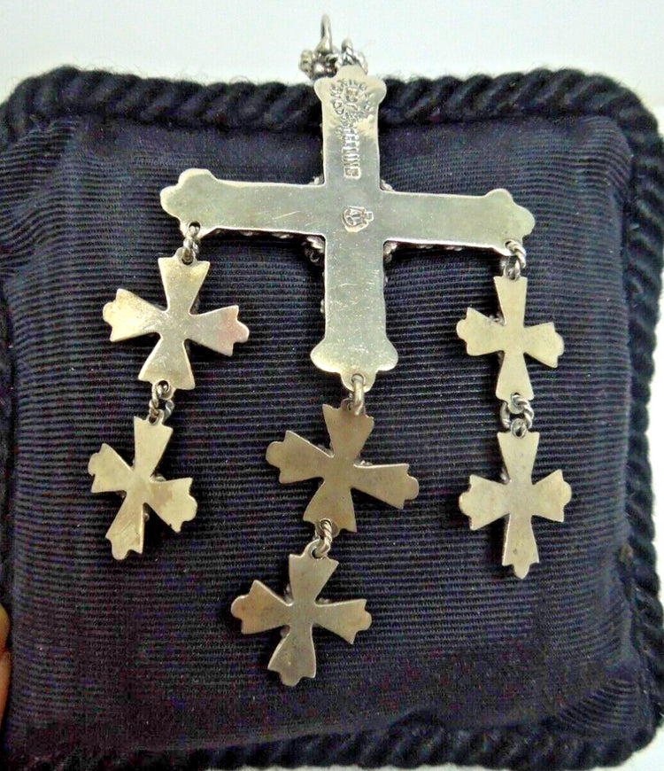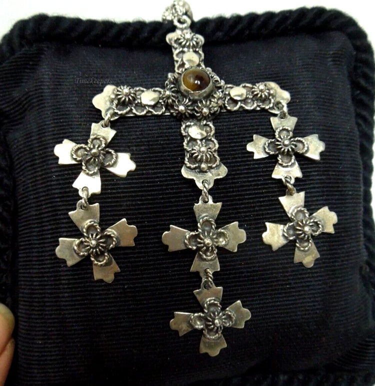 For Sale: (1) s702 Vintage 1940s Sterling Silver TIGER EYE YALALAG Etruscan 3 1/2" Cross Pendant