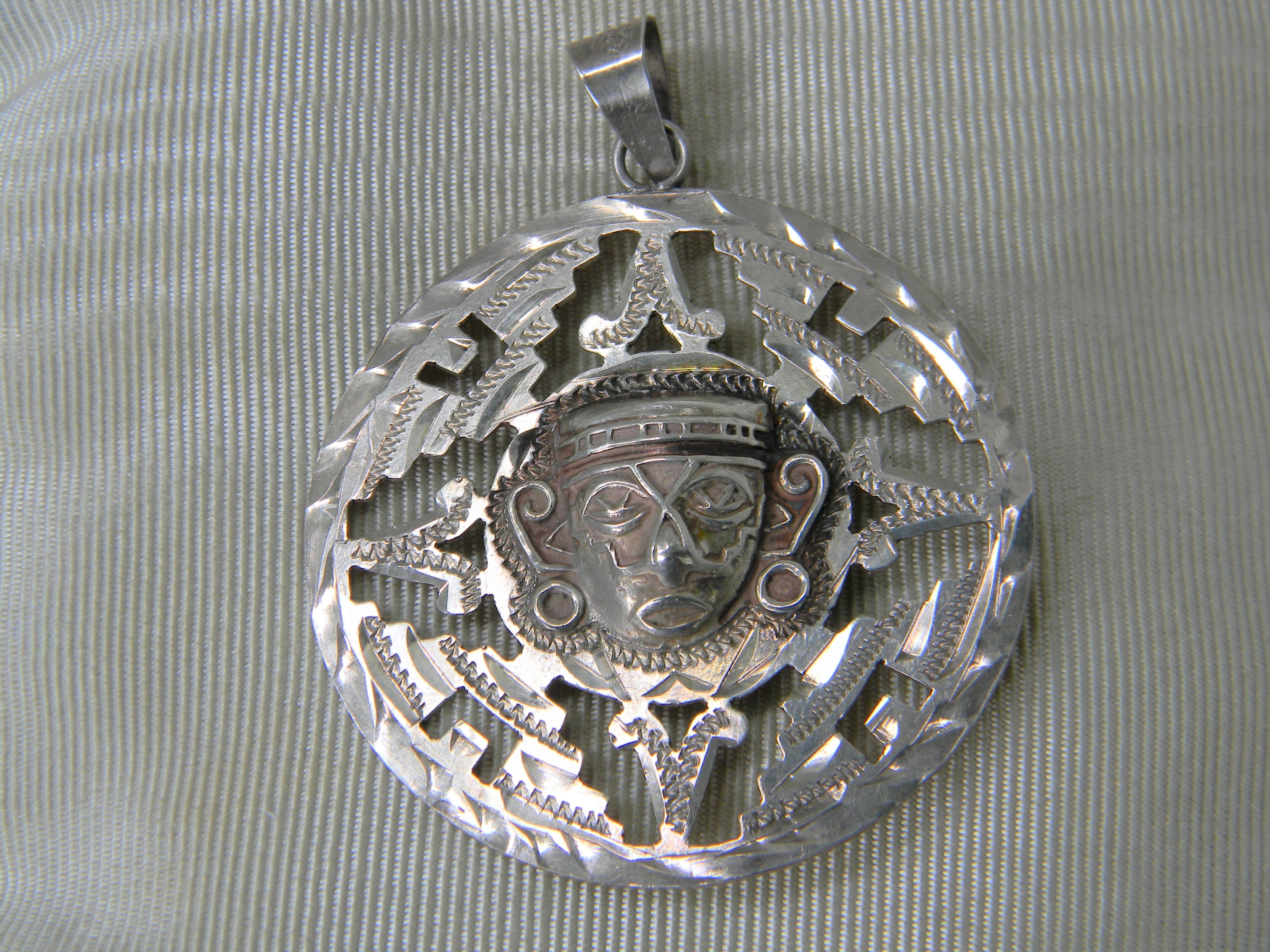 h380 Stunning Vintage Sterling Silver Mayan Calendar Round Pendant