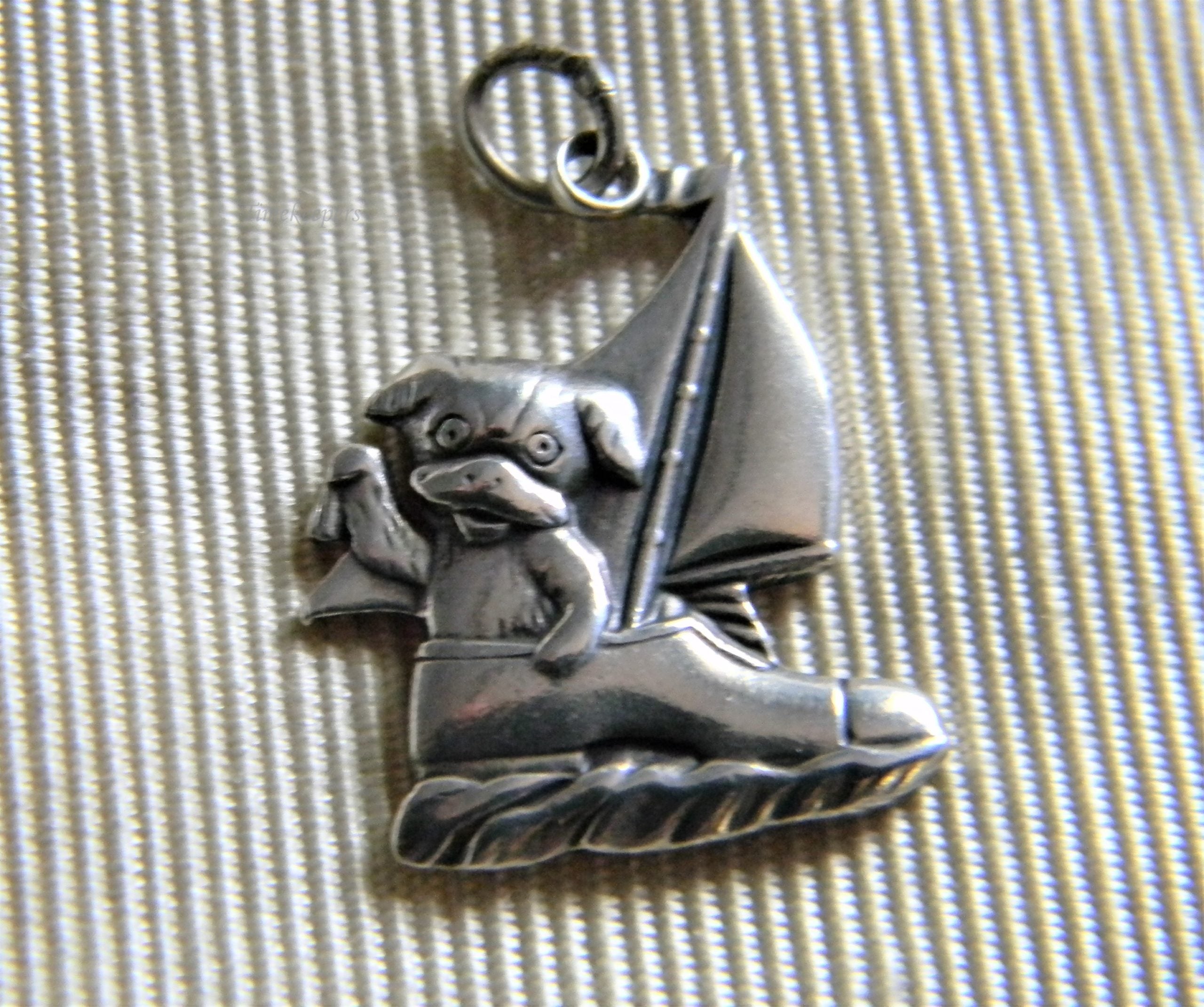 h864 Cute Vintage Sterling Silver Bear in a Shoe Boat Charm or Pendant Embossed